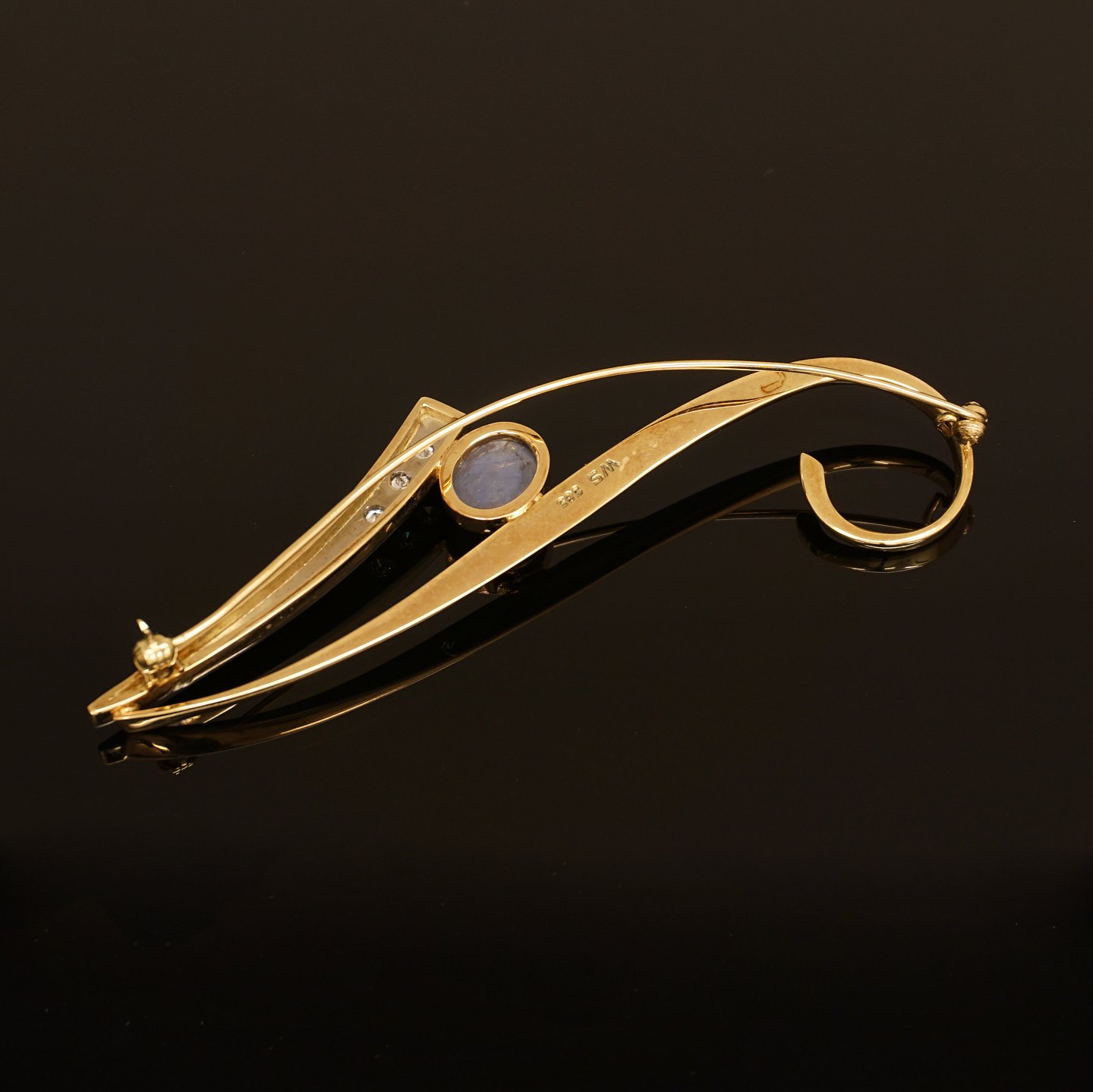 Scheelke, Tønder: Stor broche med tre diamanter. 14kt guld. L: 10cm. V: 19,3