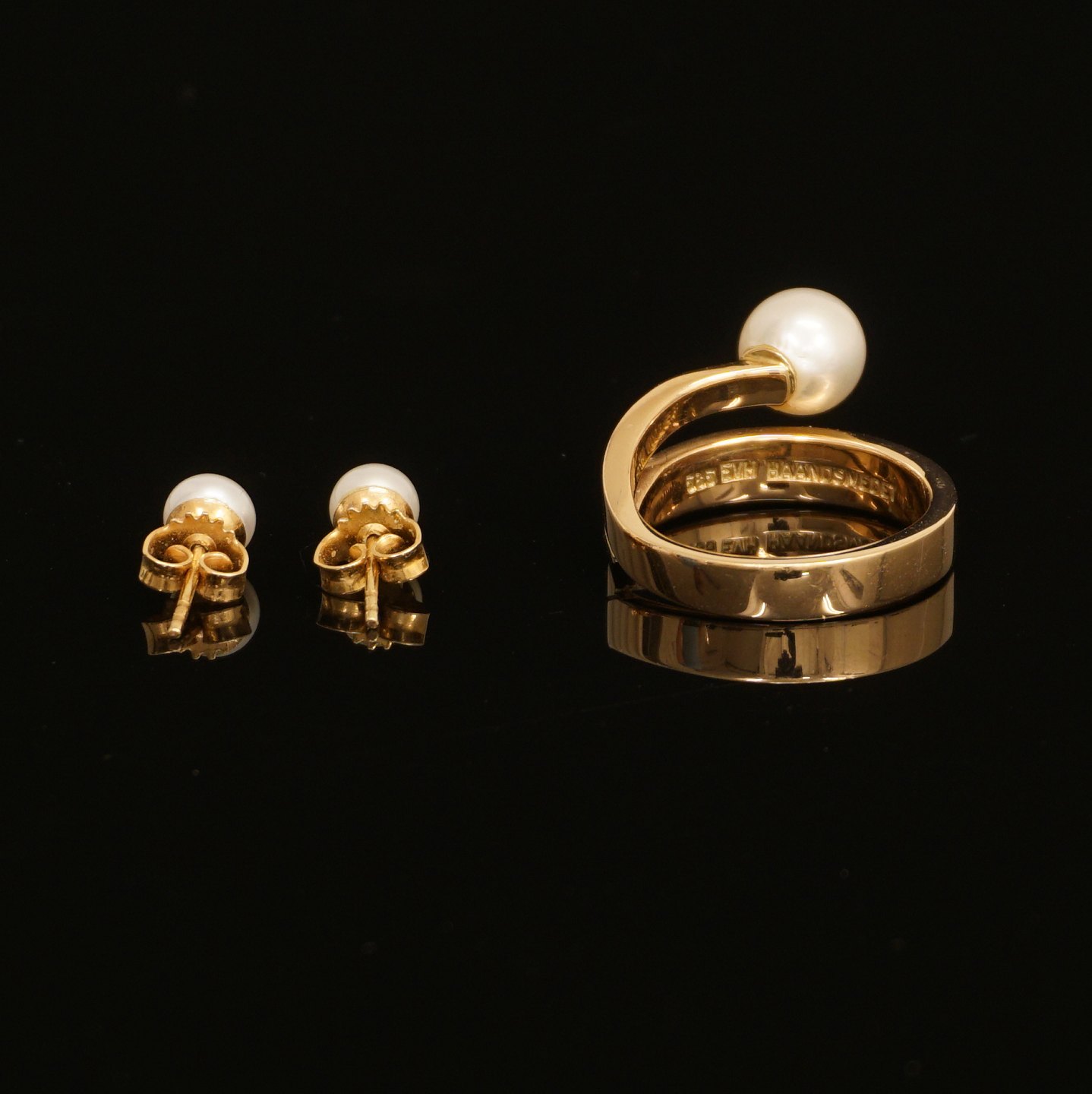 E. M. & V. Hansen: Smykkesæt bestående af ring og to ørestikker, 14kt guld, med perler
