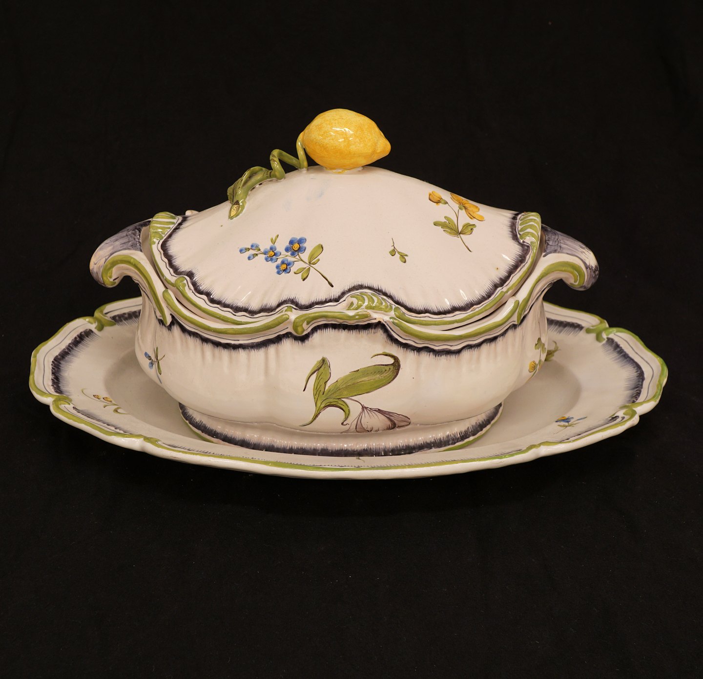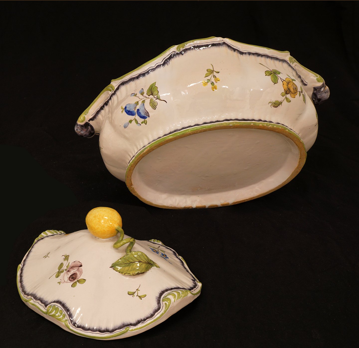 Swedish Rococo faience tureen. Stralsund circa 1770. Plate: 46x33cm. Tureen H: 21cm. L: 37cm