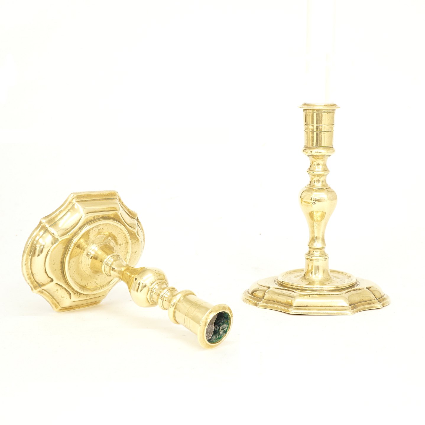 Et par kraftige Næstved-stager på oval fod, messing Danmark ca. år 1750. H: 15,3cm