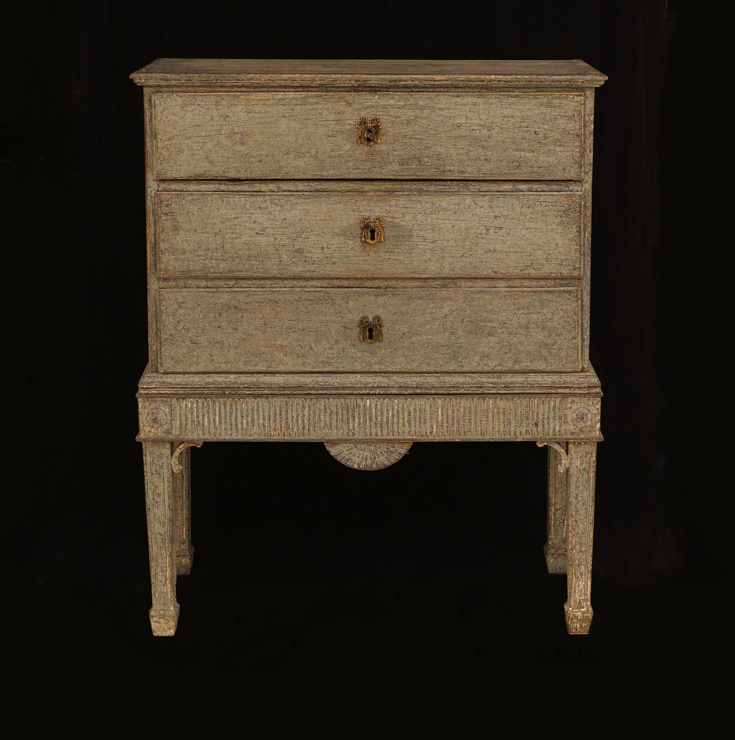 Grågrøndekoreret gustaviansk kommode. Sverige ca. år 1800. H: 90cm. B: 73cm. D: 35cm