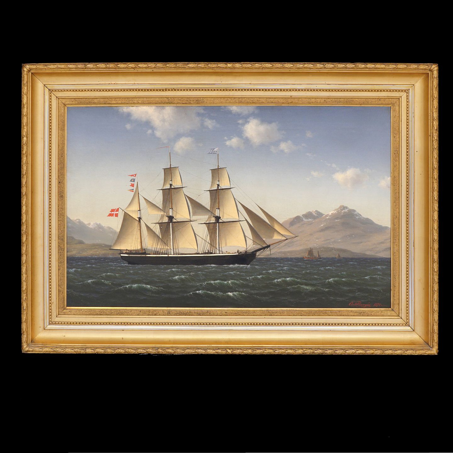 Carl Baagøe, 1829-1902, olie på lærred: Barken ”Emma Aorigne" krydsende Øefjord, Island, 1870. Malt på bestilling