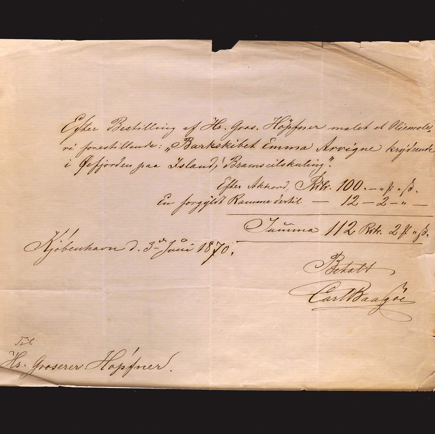 af barkens ejer, grossér Carl Julius Høpfner, 1827-1901. Original faktura fra Carl Baagøe til C J Høpfner og halvmodel af barken medfølger"> af barkens ejer, grossér Carl Julius Høpfner, 1827-1901. Original faktura fra Carl Baagøe til C J Høpfner og halvmodel af barken medfølger"> Aabenraa Antikvitetshandel * Carl Baagøe, 1829-1902, olie på lærred: Barken ”Emma Aorigne" krydsende Øefjord, af barkens ejer, grossér Carl Julius Høpfner, 1827-1901. Original faktura fra Carl Baagøe til C J Høpfner og halvmodel af barken medfølger">
