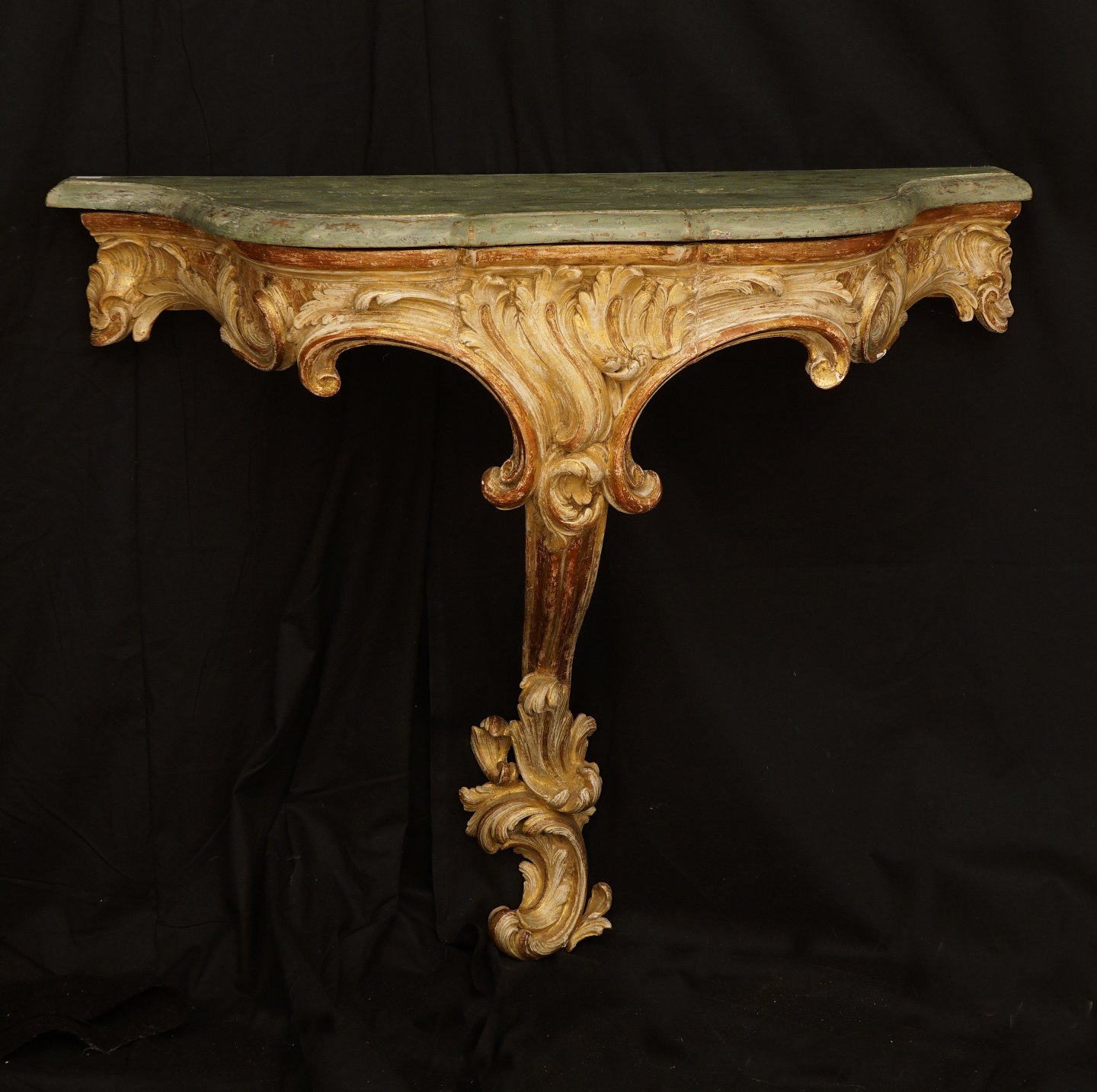 Forgyldt Rokoko konsolbord med marmorimiteret træplade. Danmark ca. år 1750. H: 78cm. Plade: 90x40cm