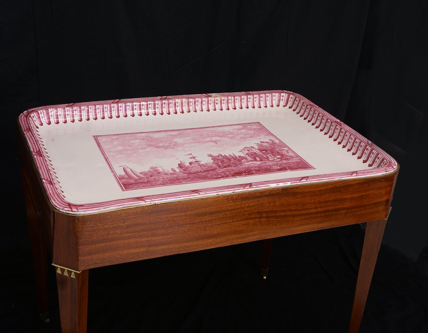 A Marieberg faience tray top-table. Sweden circa 1765. H: 75,5cm. Tray: 61x90cm