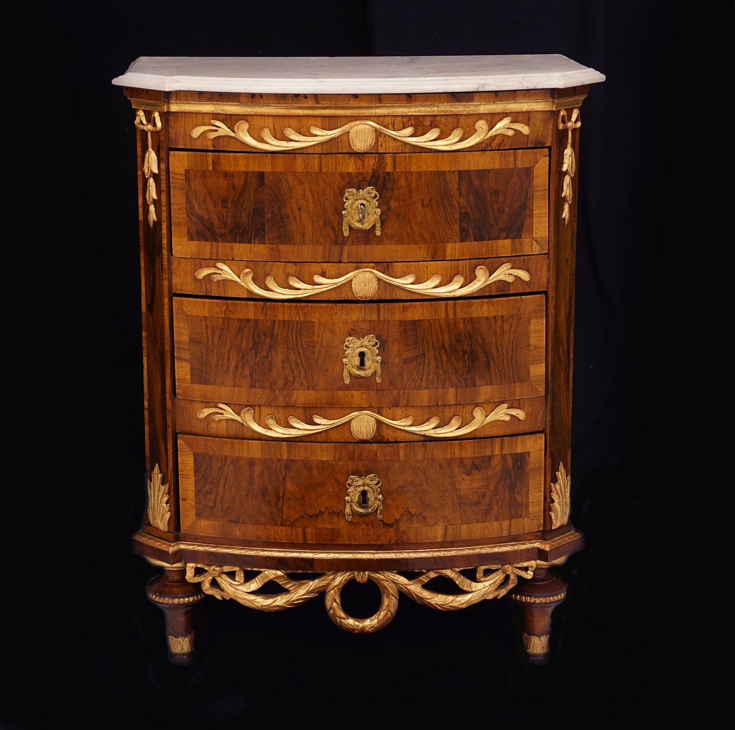 A Northgerman walnut veneered commode with marble top and gilt ornaments. Altona circa 1780. H: 97cm. W75cm. D: 40cm