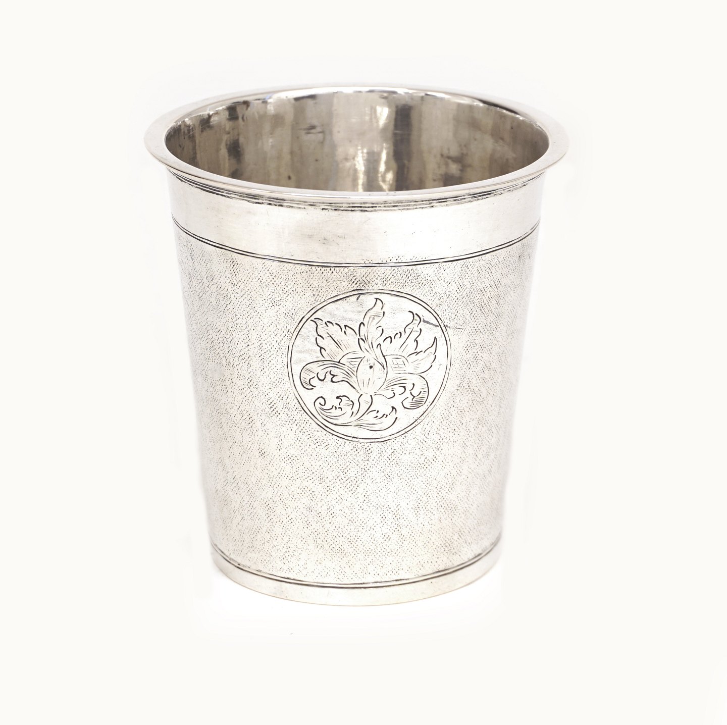 Nålepunslet sølvbæger. Mester: Christen Olesen, 1706-62, Vejle. Dateret 1721. H: 8,7cm. V: 131gr