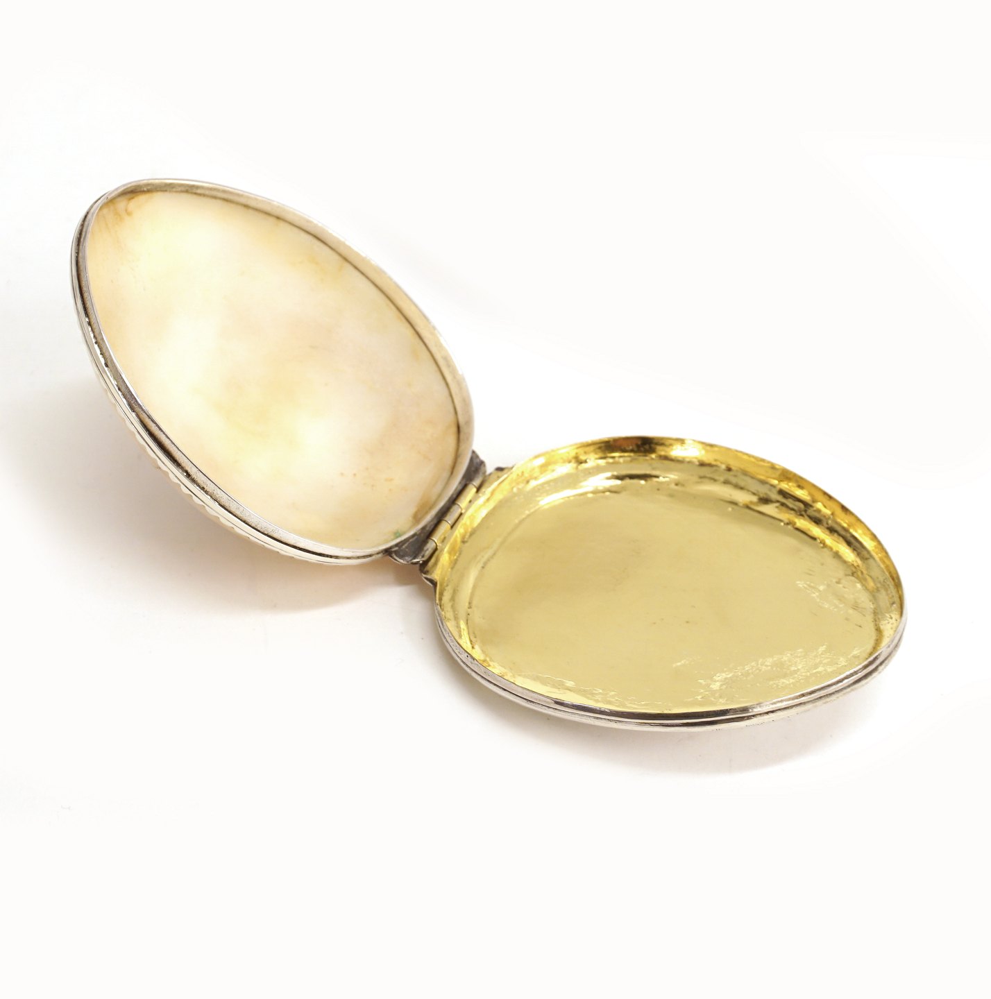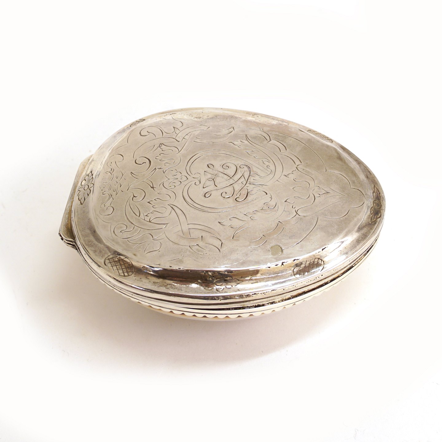 Sølvmonteret konkylie prydet med spejlmonogram og indvendig forgyldning. L: 8,5cm