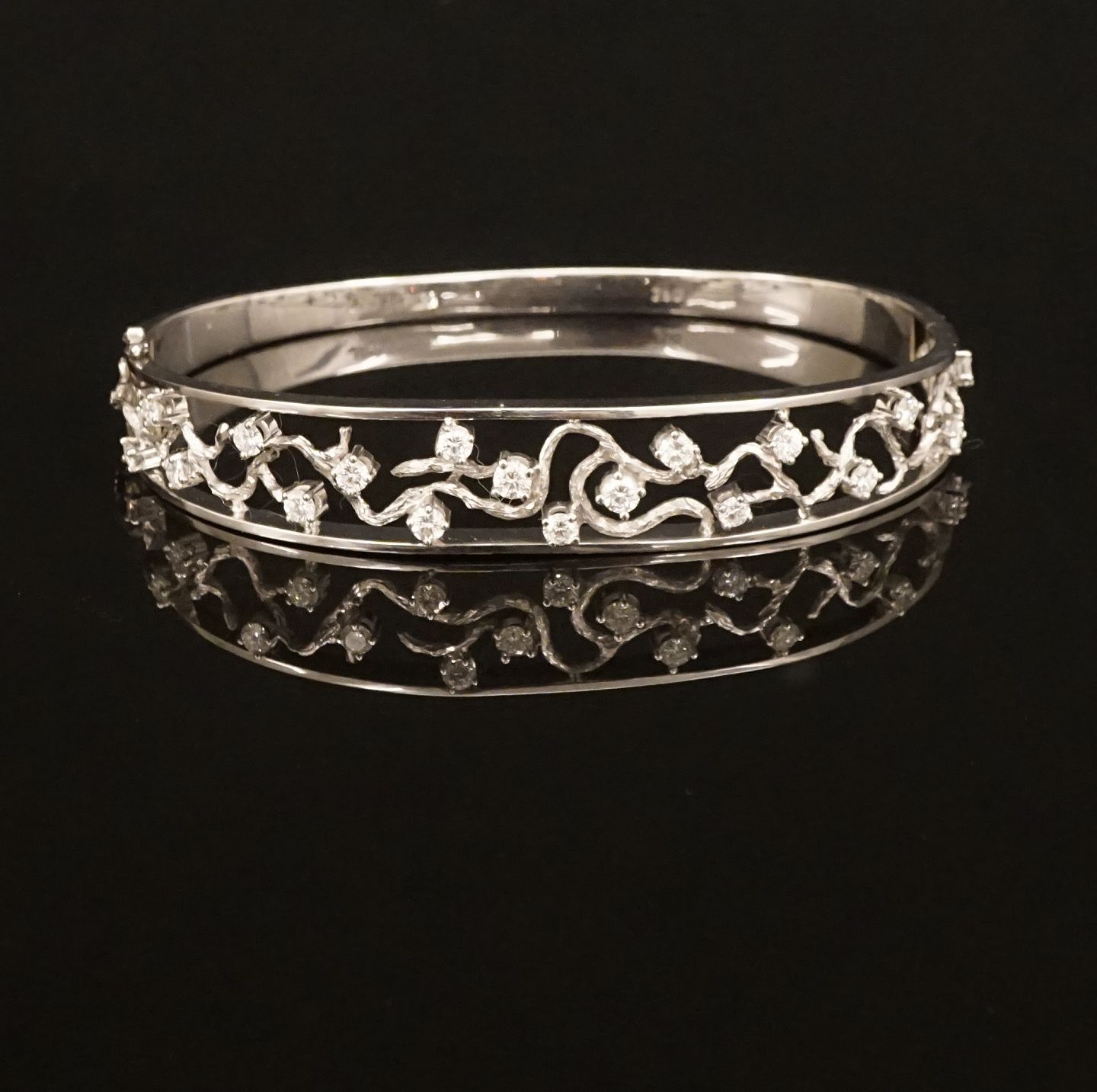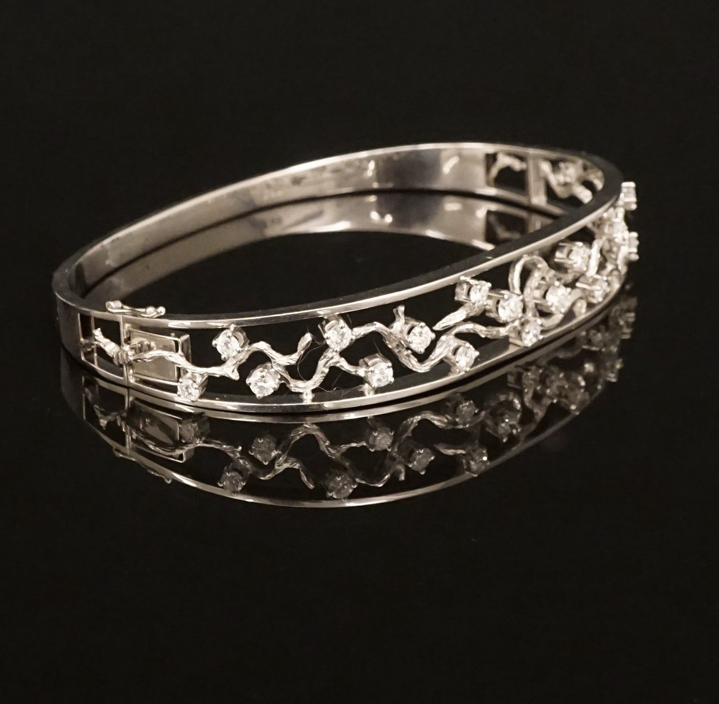 Kgl. Hofleverandør John Rørvig, København: Armring i 18kt hvidguld prydet med 18 diamanter. Ca. 1,1ct i alt. Top wesselton/VVS. Skjult kasselås med sikkerhedslås. Indv. mål: 6,9x5,2cm