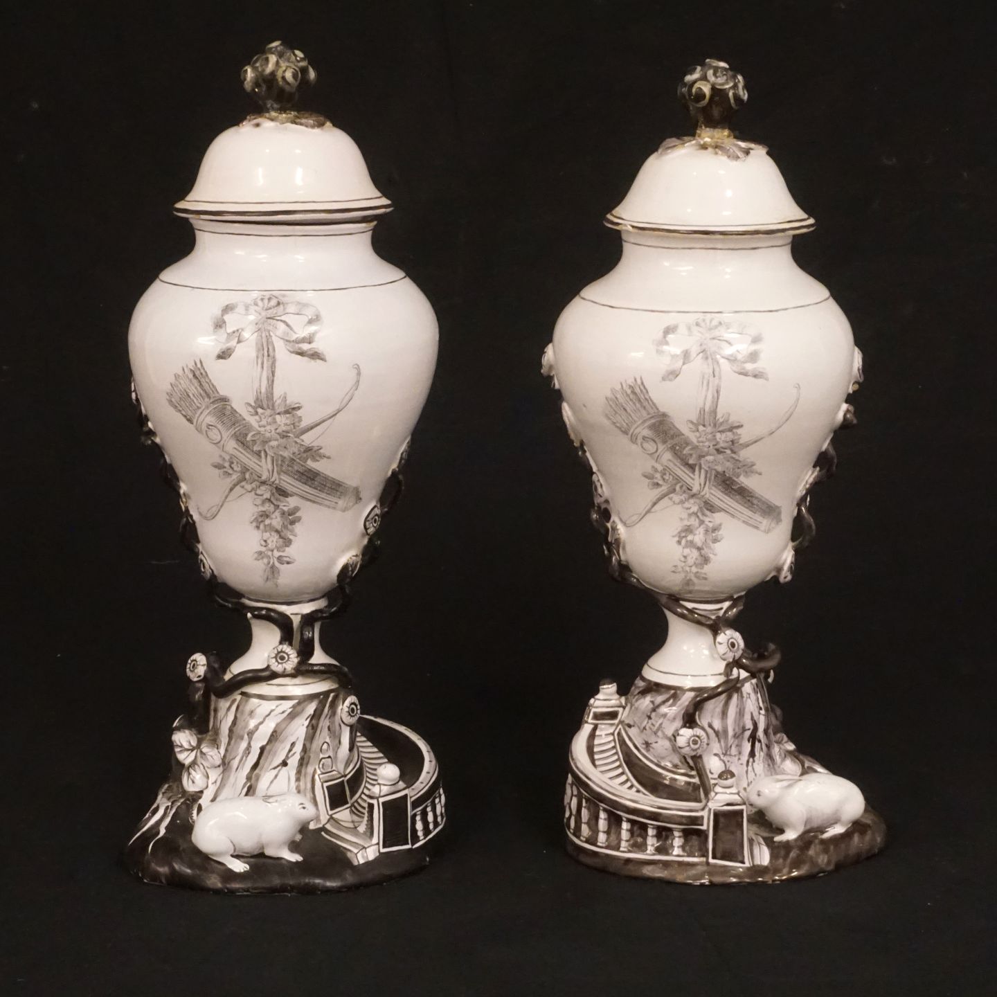 Two 18th century rabbit faience vases. Marieberg, Sweden, circa 1775. Signed. H: 35cm