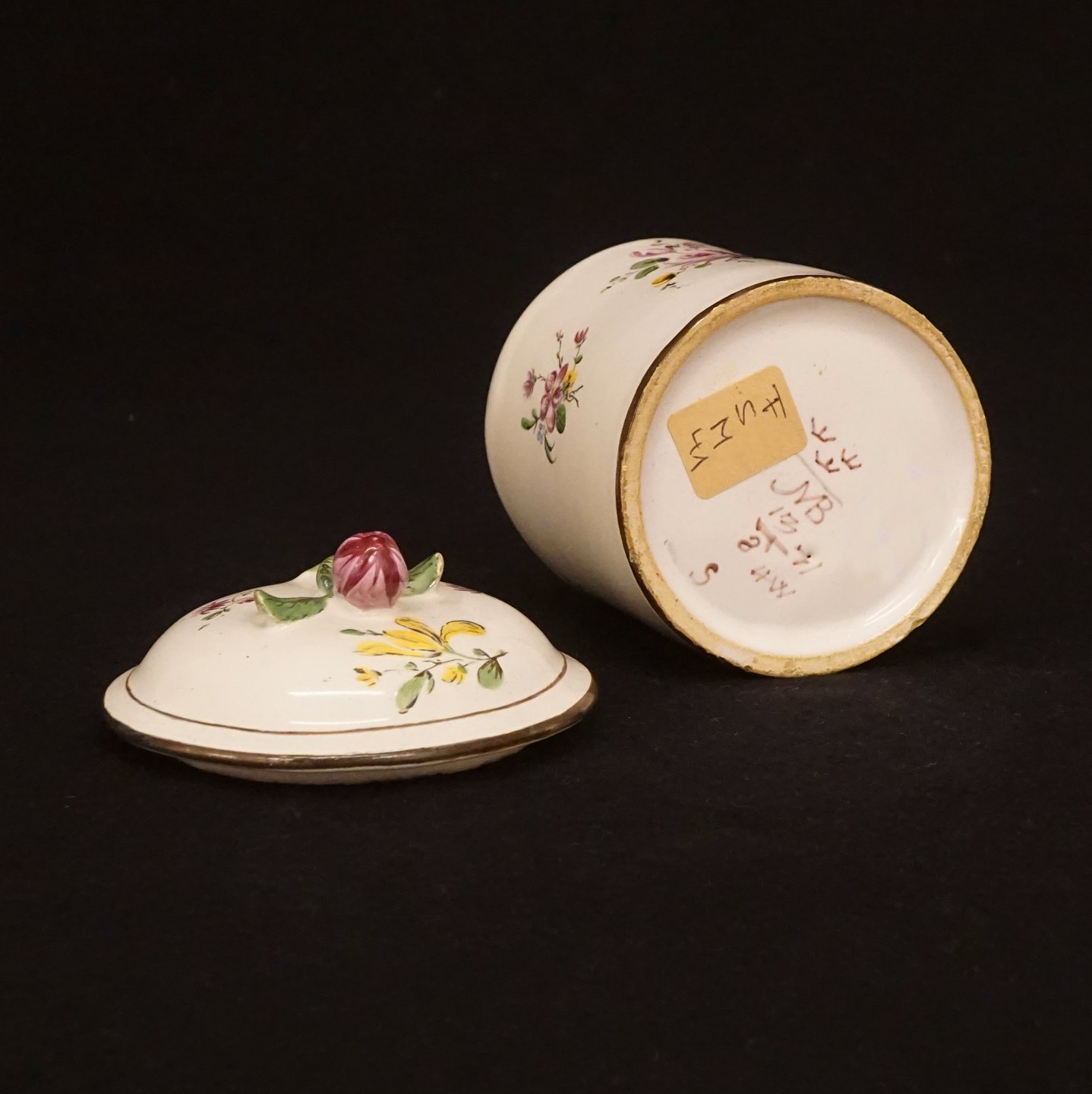 A lidded faience jar. Signed Marieberg, Sweden, 1771. H: 9cm