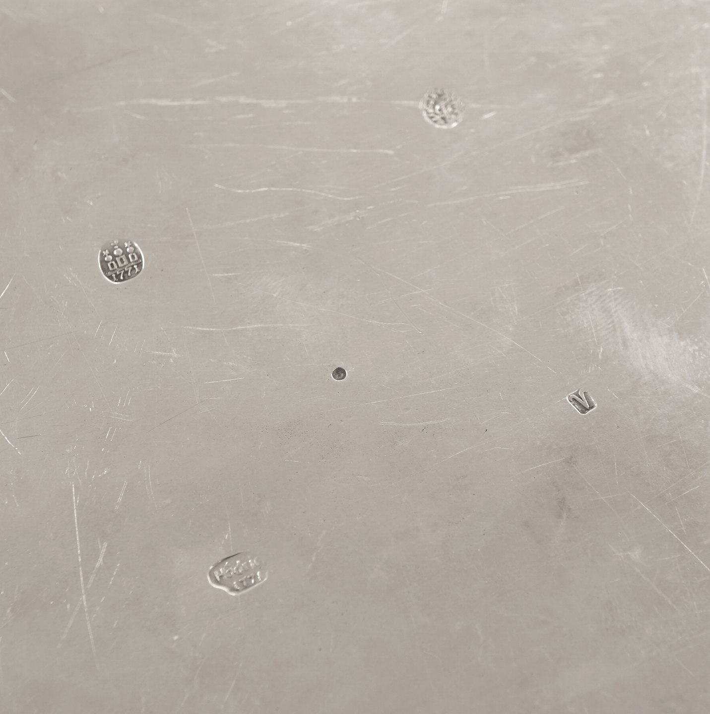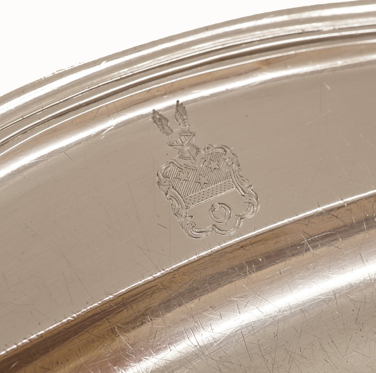 Johan Georg Høderich, København, 1760-83: Ovalt ligeknækket sølvfad. På fane prydet med våben.