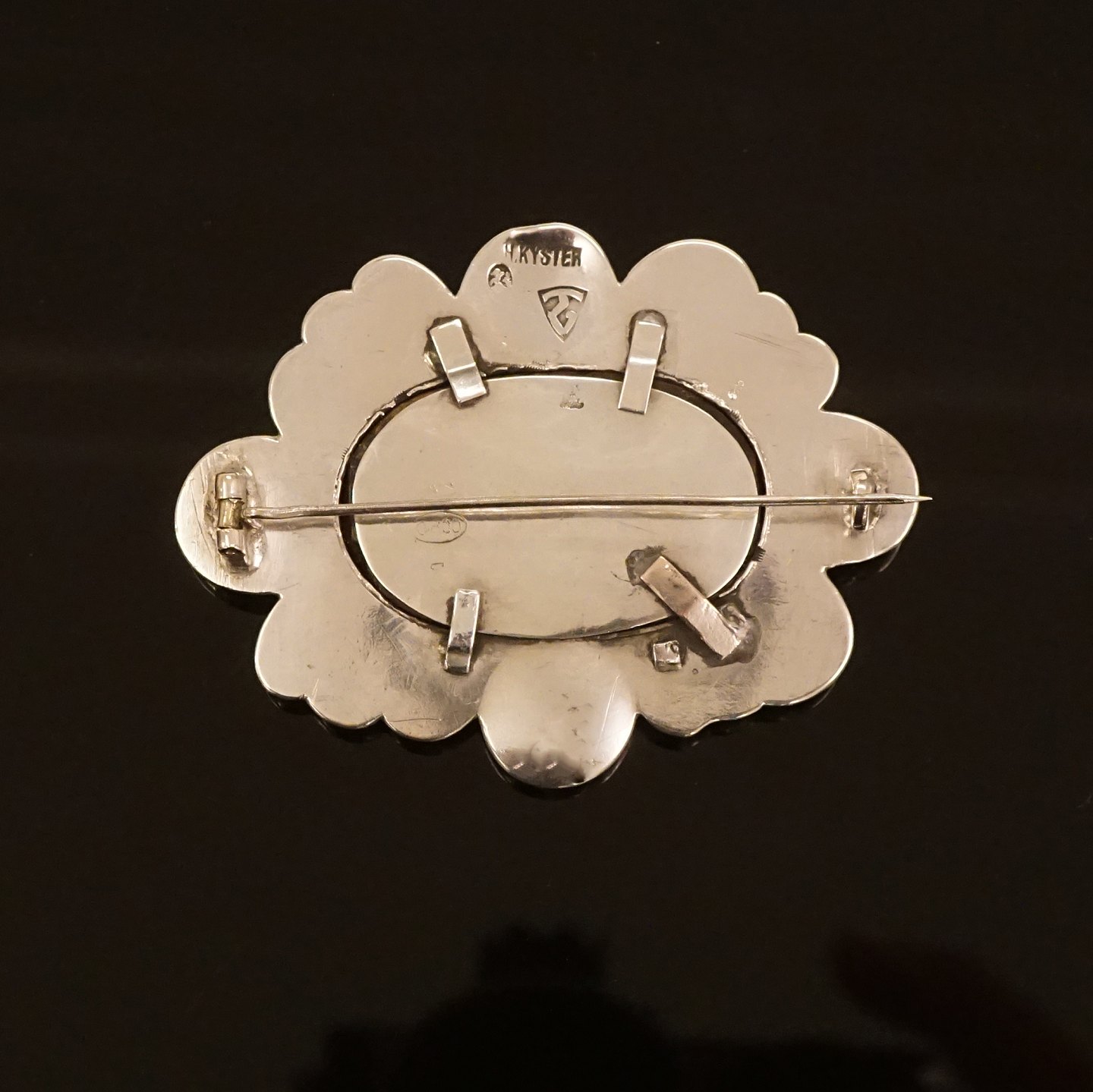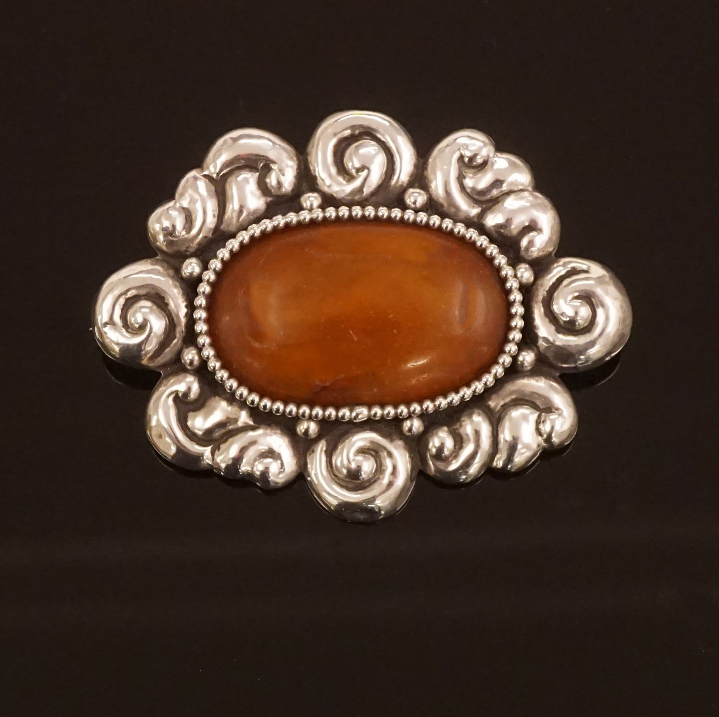 A large amber mounted silver brooch Stamped by Thorvald Bindesbøll and Holger Kyster, Denmark Size: 6,5x5cm Item number: 28450