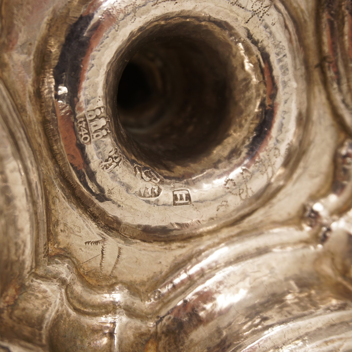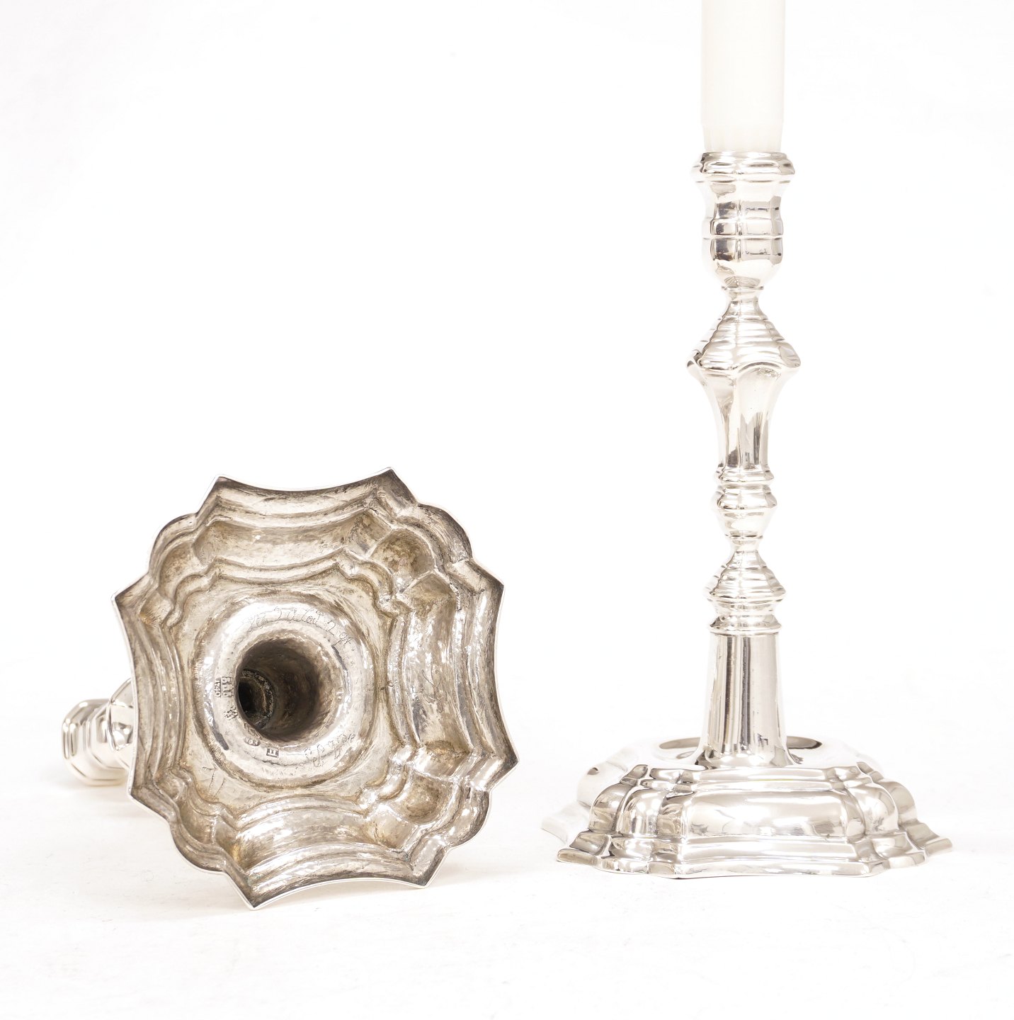Jens Christensen, Copenhagen, 1734-62: A pair of mid 18th century baroque silver candlesticks. Dated 1740. H: 19,2cm. W: 593gr