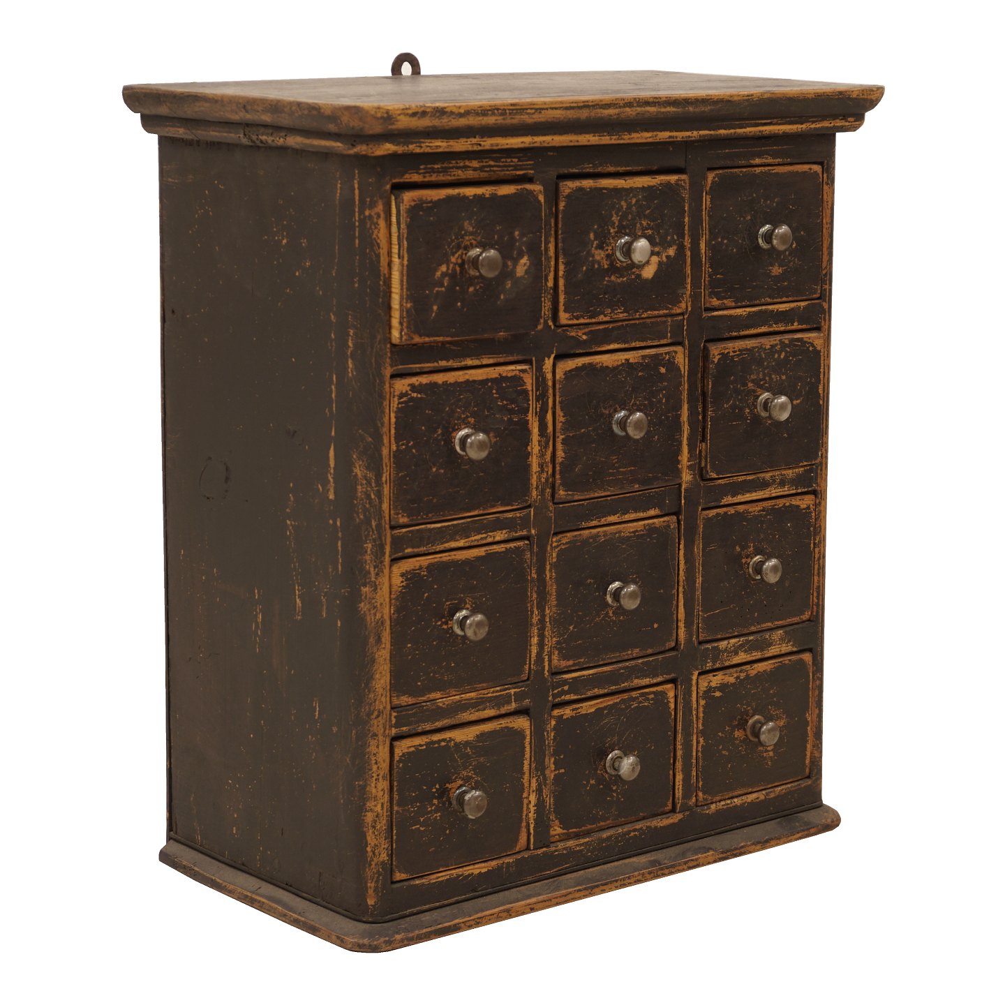 A black decorated wall-mounted cabient with 12 drawers. Denmark circa 1860-80. H: 61cm. W: 54cm. D: 29cm
