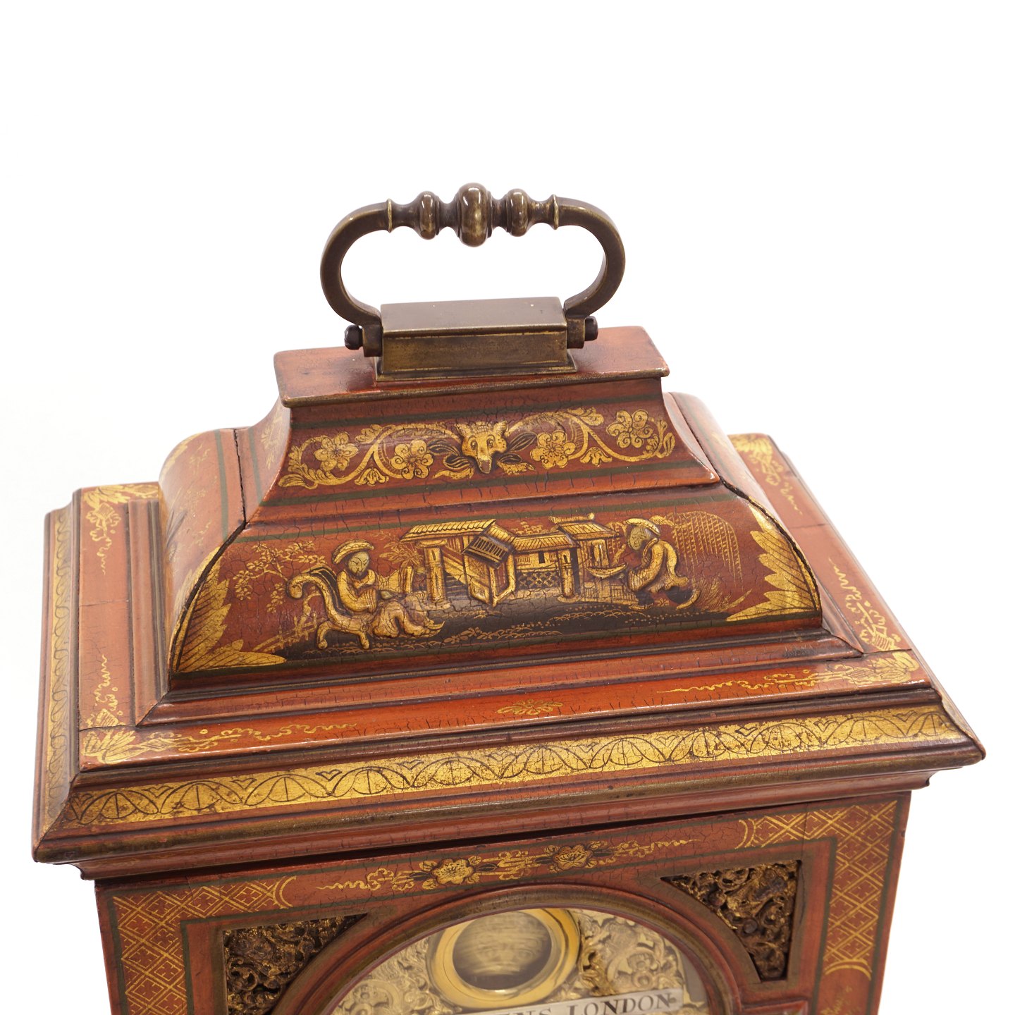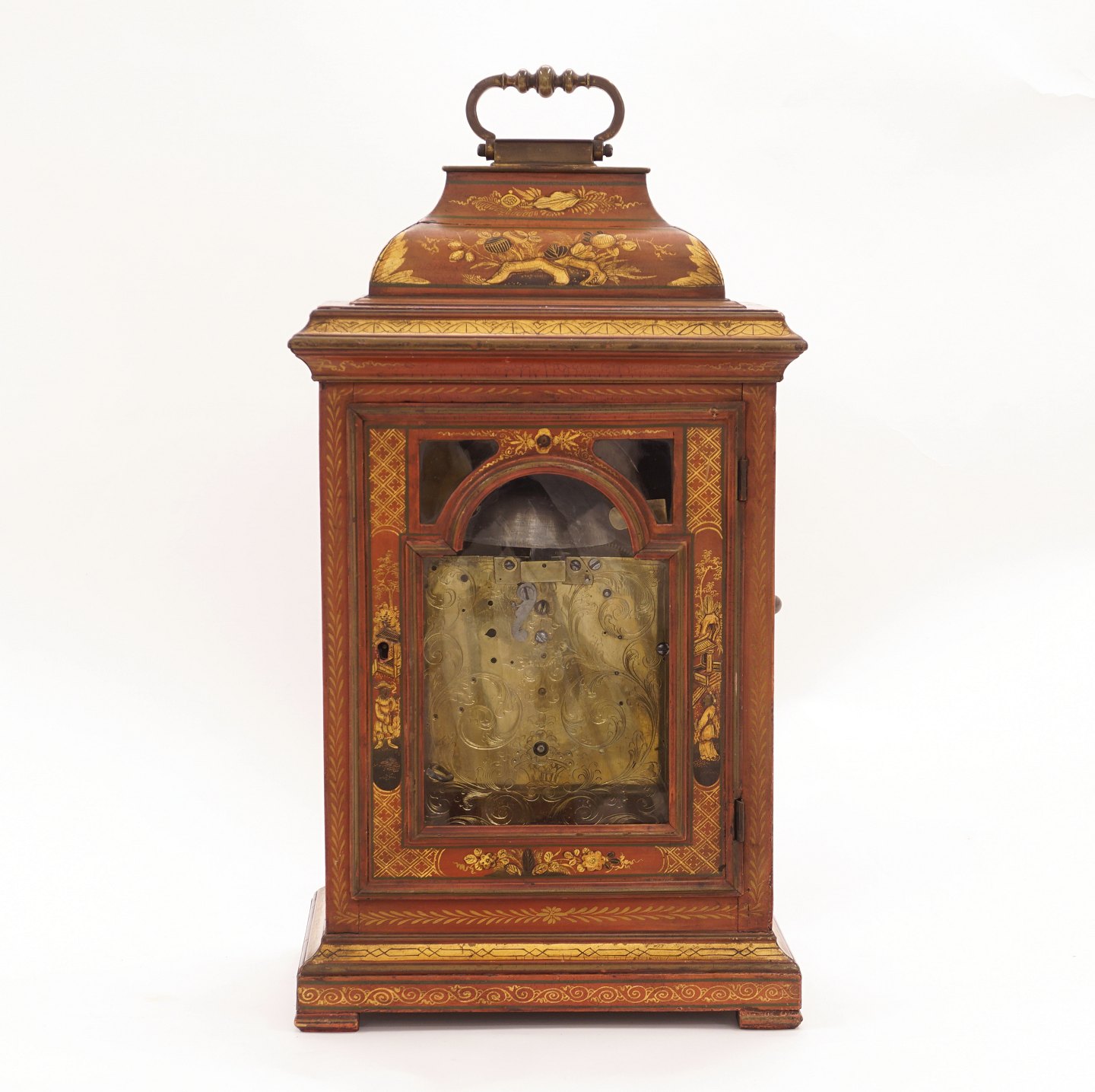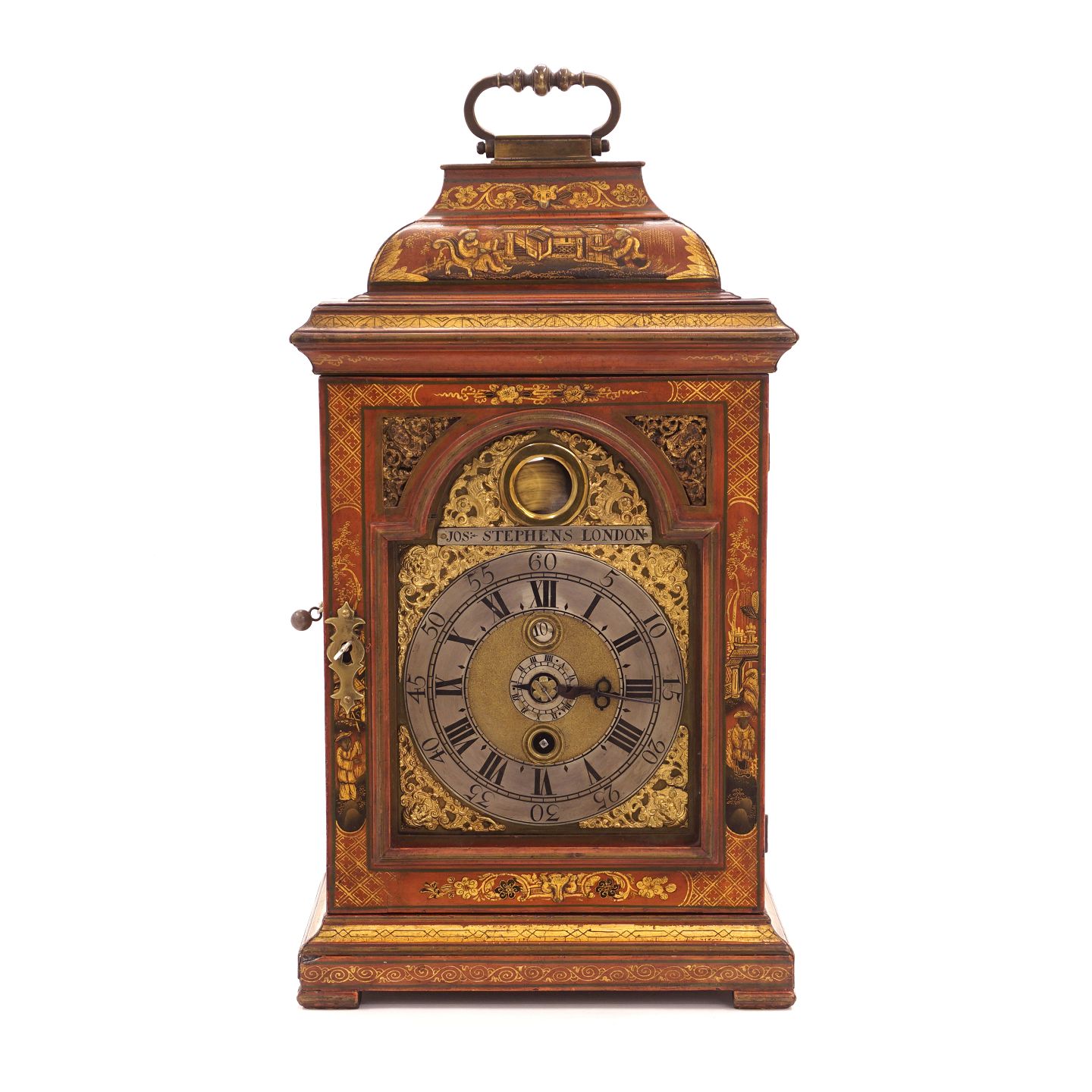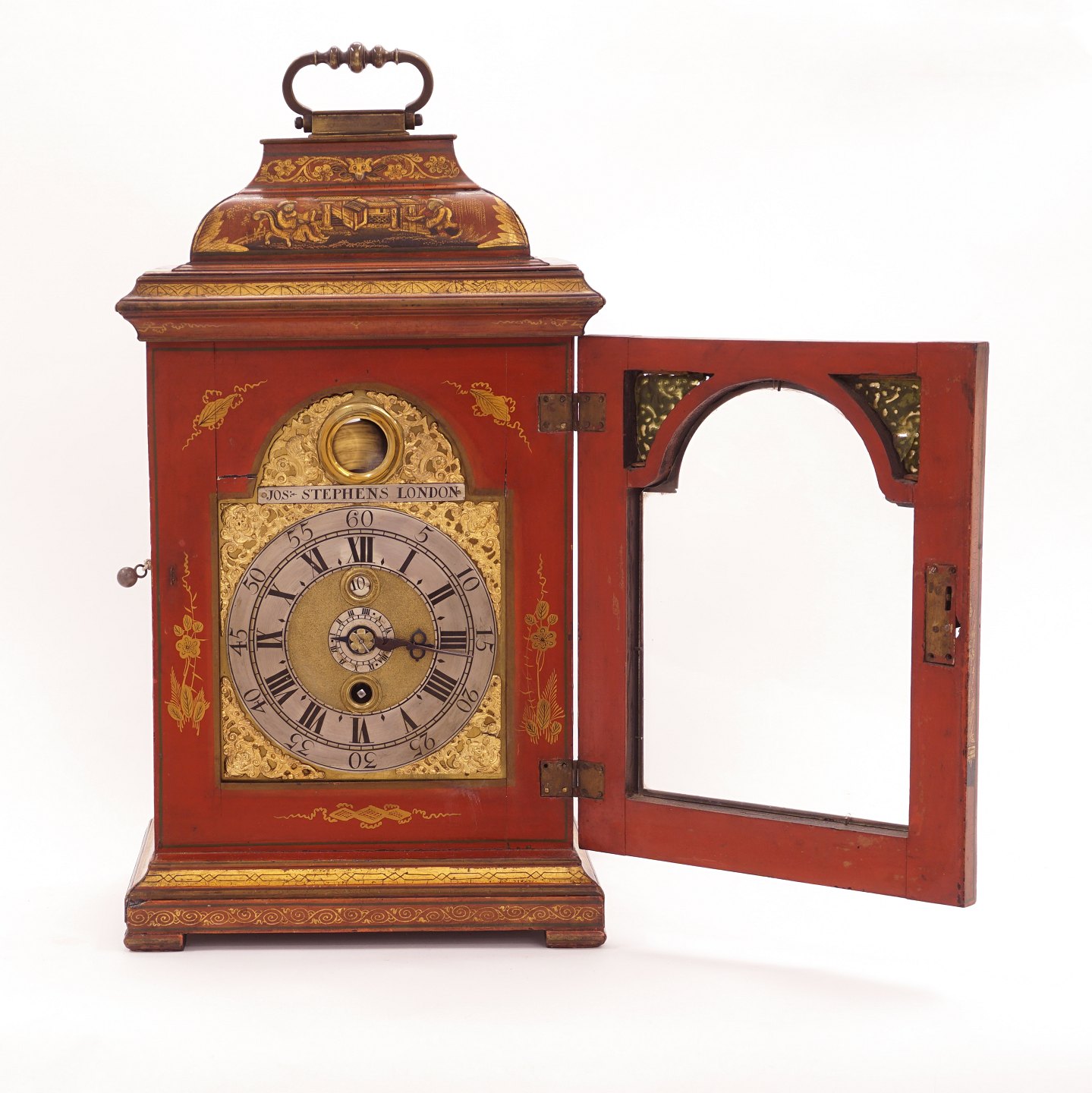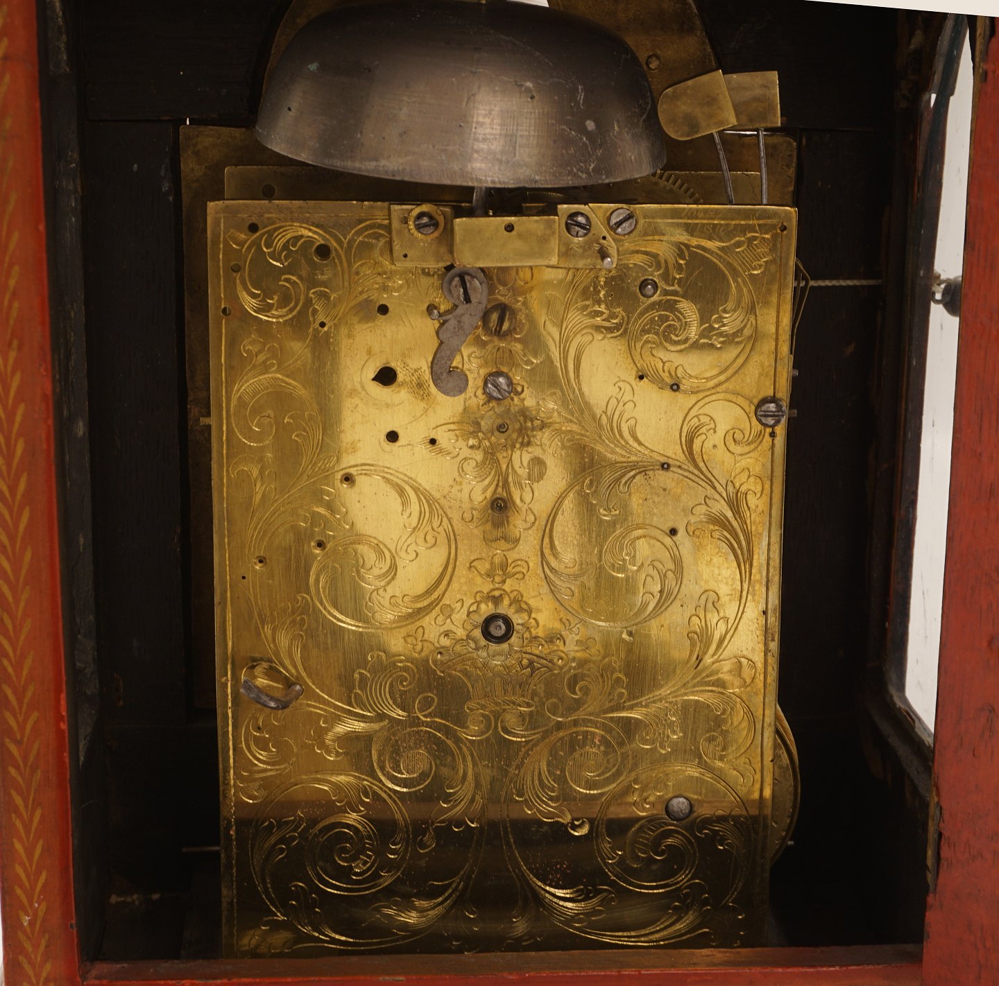 George II lygteur i rødlakeret kasse prydet med kineserier. Værk med dato og alarmfunktion. Signeret Jos. Stephens London ca. år 1740-50. H: 47cm