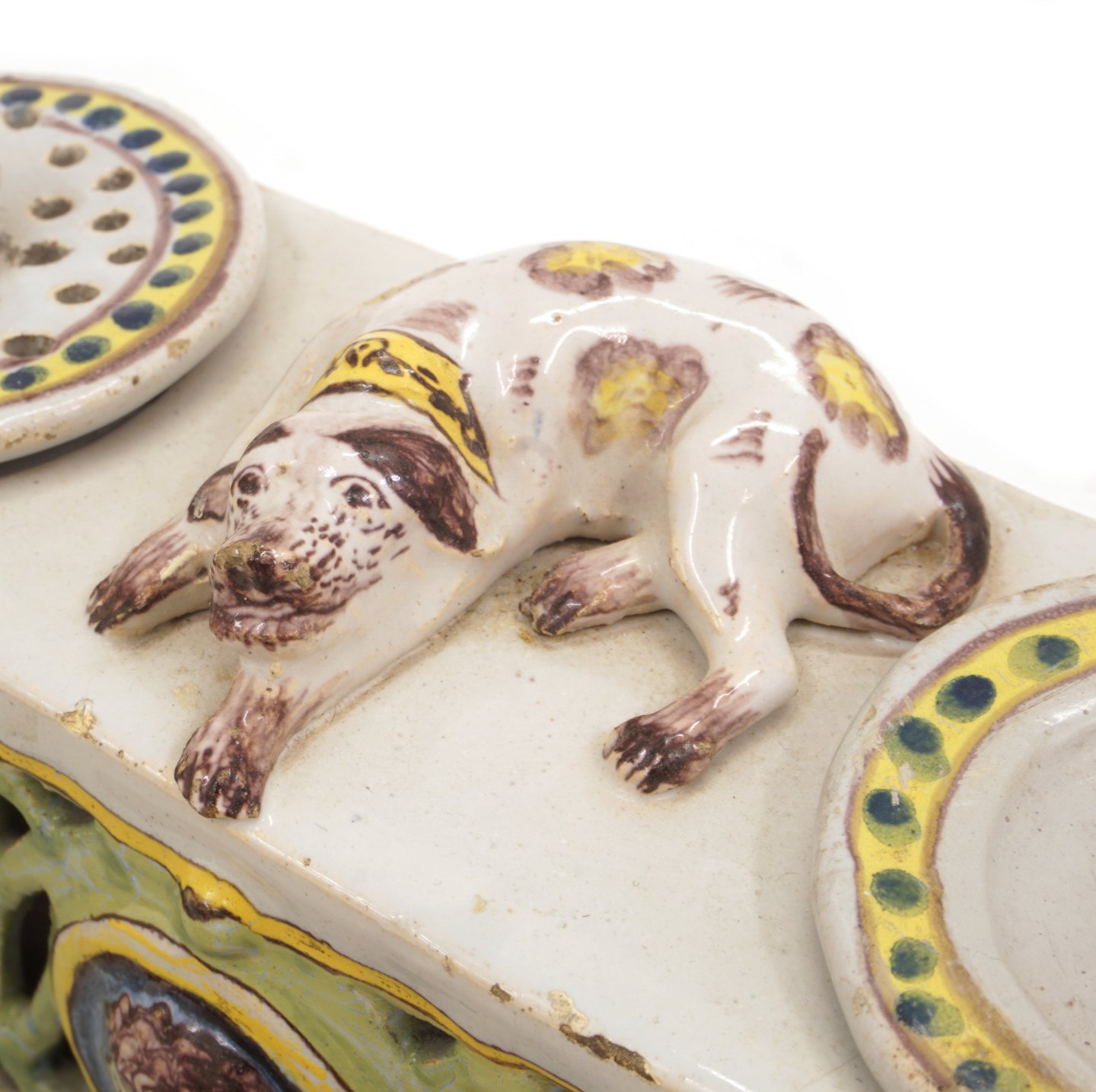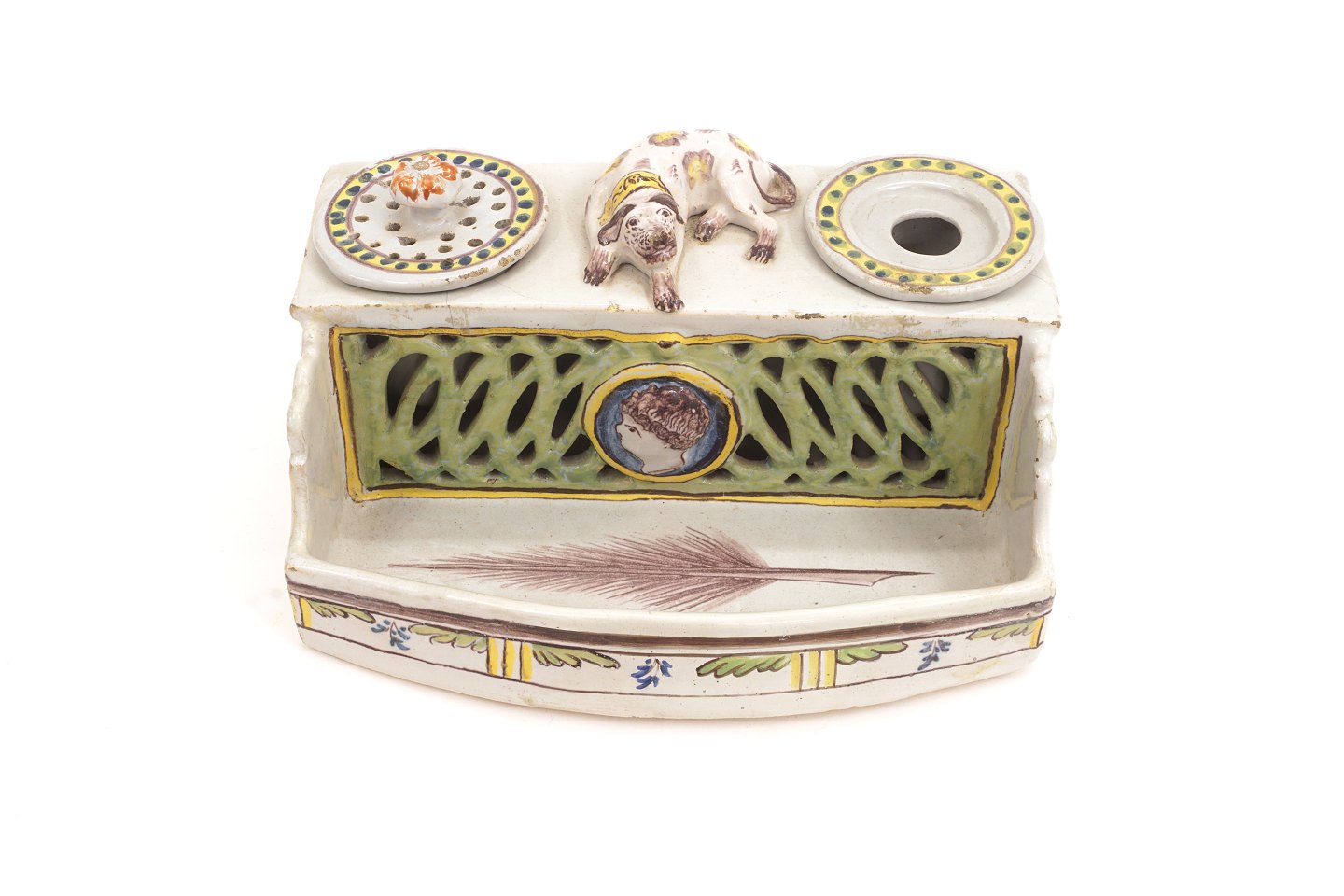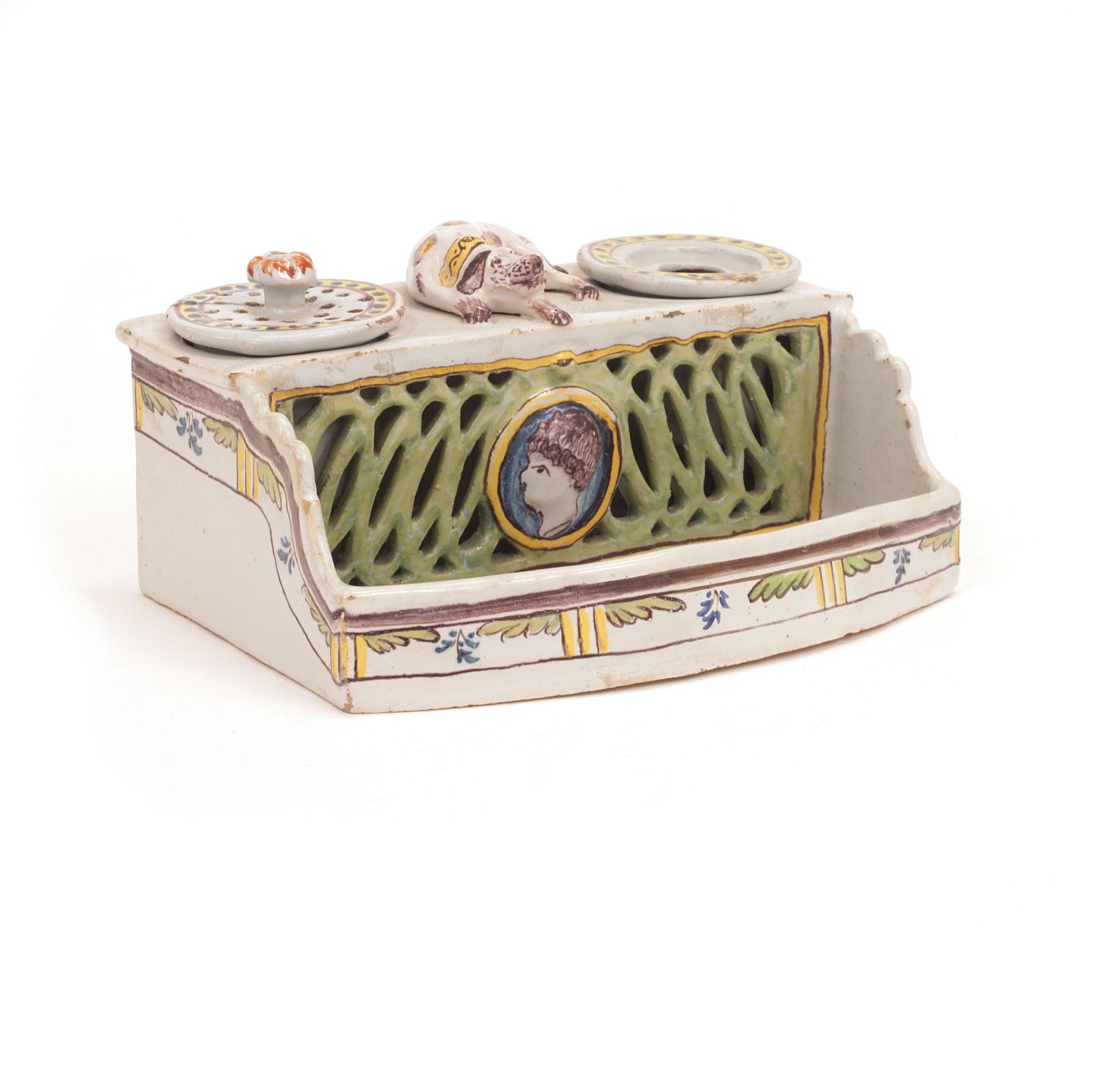 Kellinghusen skrivetøj i fajance, flerfarvet. Prydet med protræt og liggende hund. Kellinghusen ca. år 1800. H: 8,7cm. L: 18cm