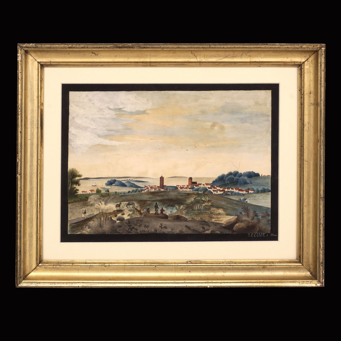 View of the danish town Vordingborg. Watercolor. Signed "Regine Petrea". Visible size: 29x40cm. With frame: 44x55cm