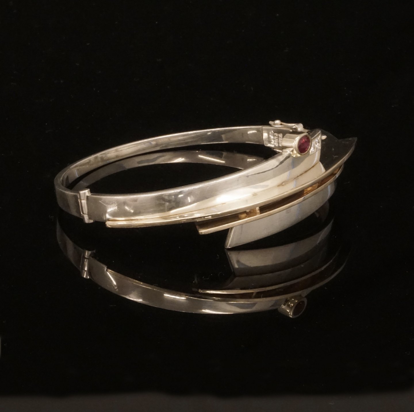 A 14kt gold and sterlingsilver bangle with two diamonds of ca. 0,08ct Size: 6,6x6cm Item number: 5024