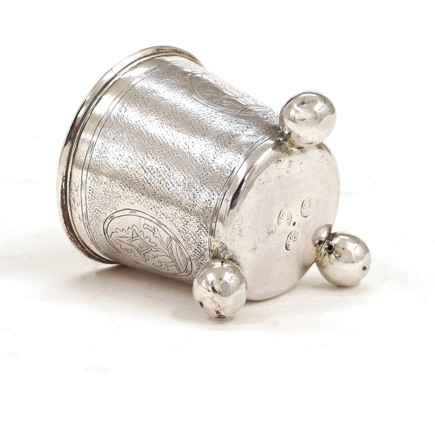 Nålepunlset sølvbæger på tre kuglefødder prydet med tre kartoucher, hvori spejlmonogram "CS"