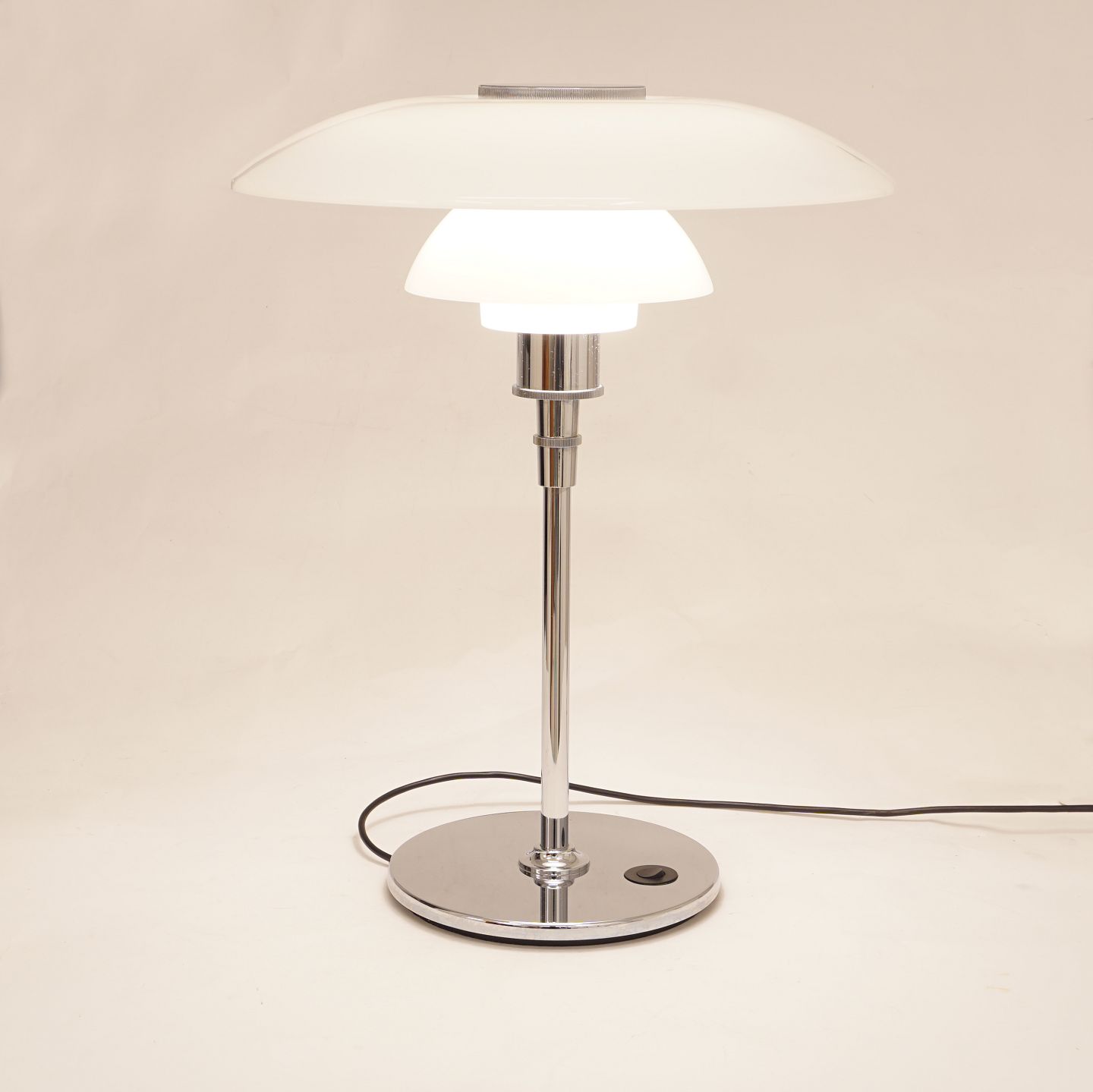 Ph 4½-3½ bordlampe med forchromet stel med afbryderknap. Største skærm D: 45cm