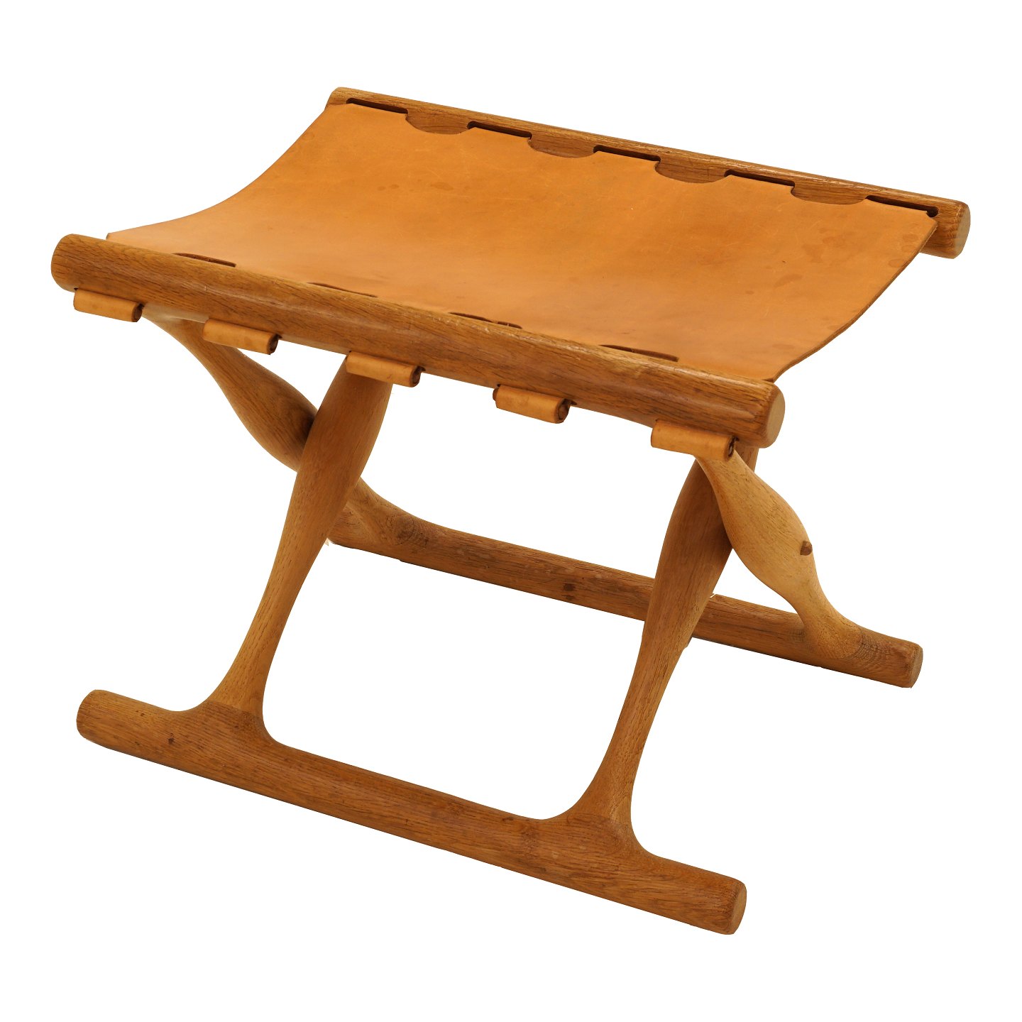 Guldhøj skammel. Poul Hundevad, Guldhøj skammel i eg med flot patineret cognacfarvet kernelæder