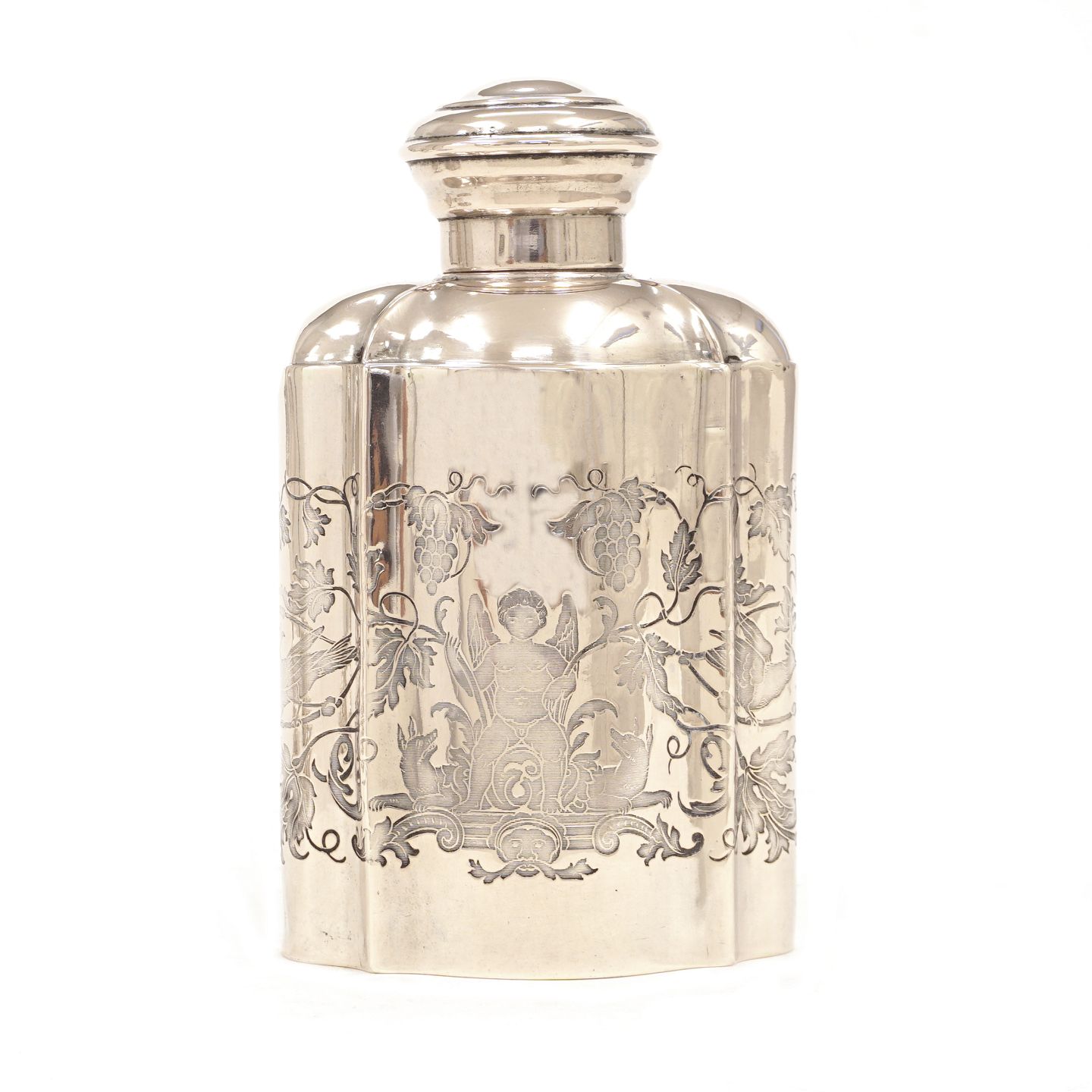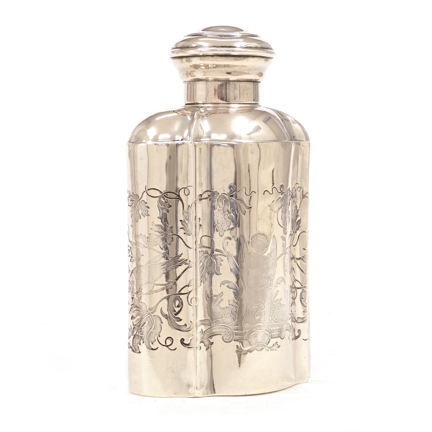 Tedåse i sølv med talrige dekorationer. Mathias Møller, Haderslev, 1842-68. H: 13,4cm. V: 123,5gr