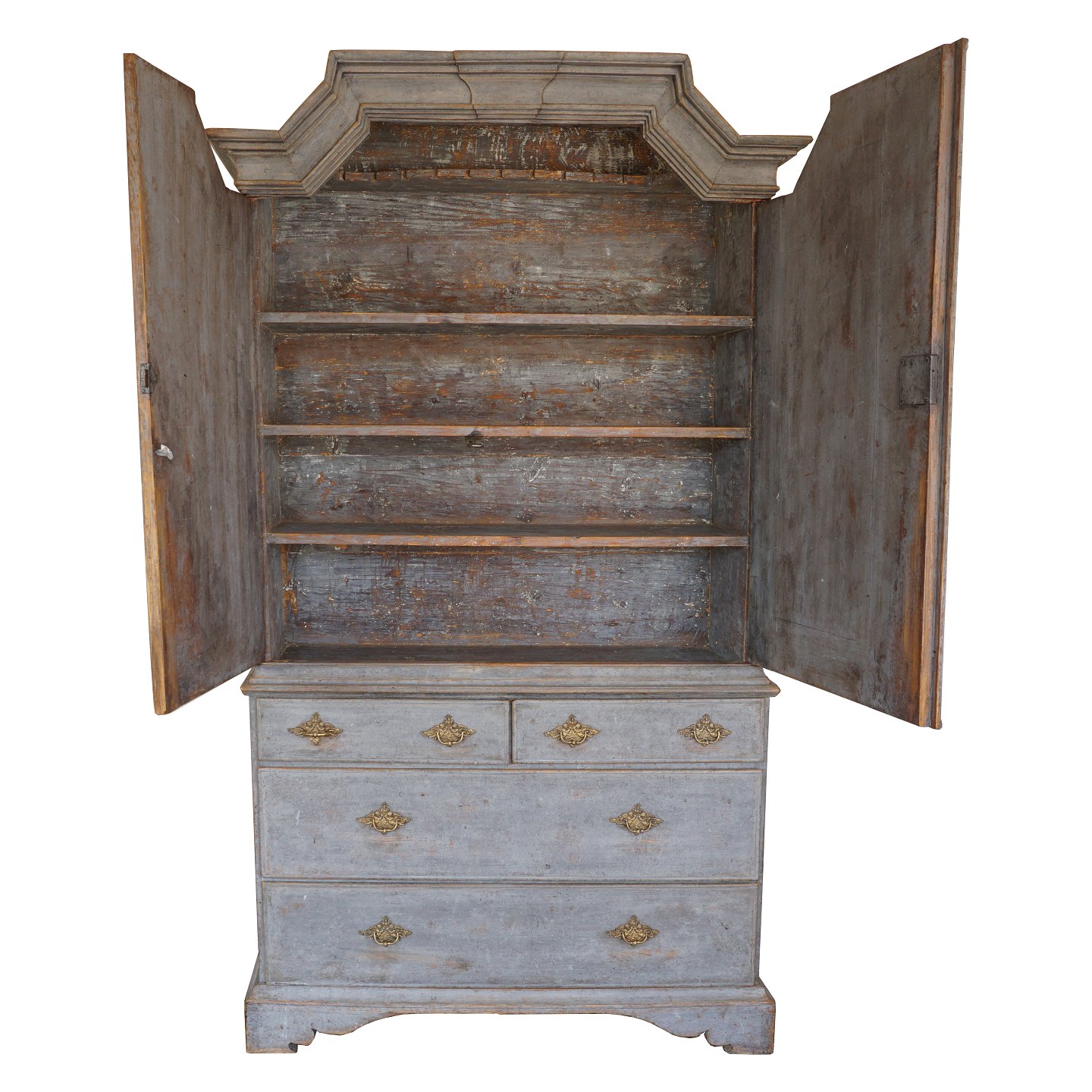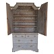 Blådekoreret barokskab. Underskab med skuffer. Overskab med to døre, hvor bag hylder. Sverige ca. år 1750. H: 199cm. B: 112cm. D: 38cm