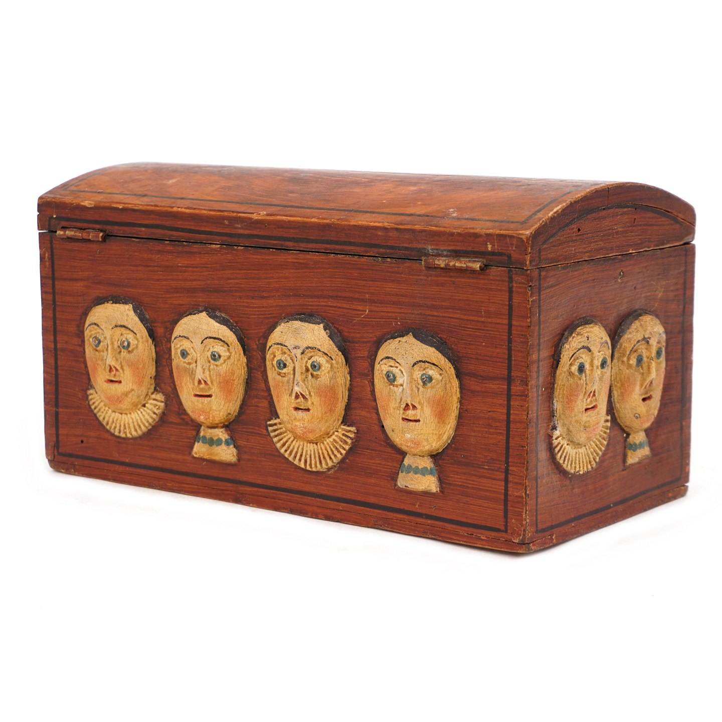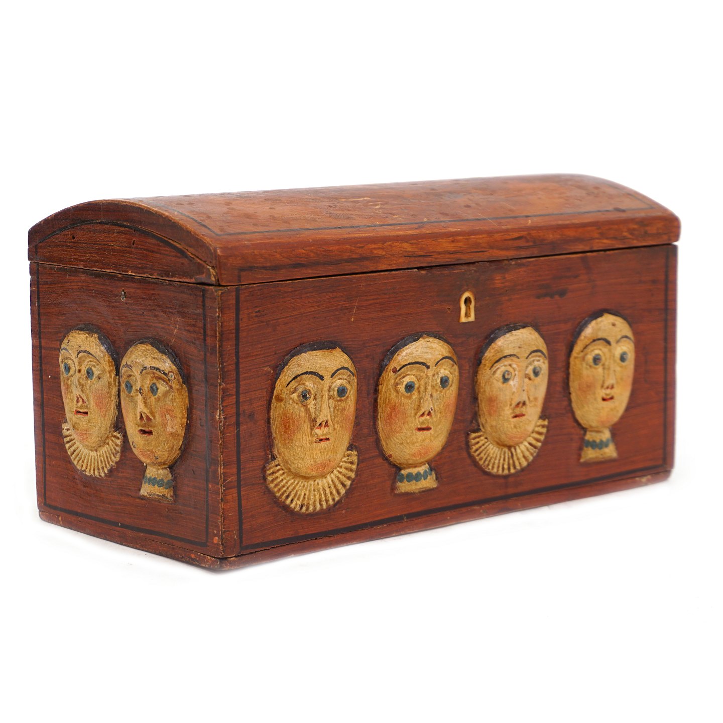 Originaldekoreret træskrin prydet med ansigter i relief. Danmark ca. år 1800. H: 14cm. L: 26cm. D: 13cm