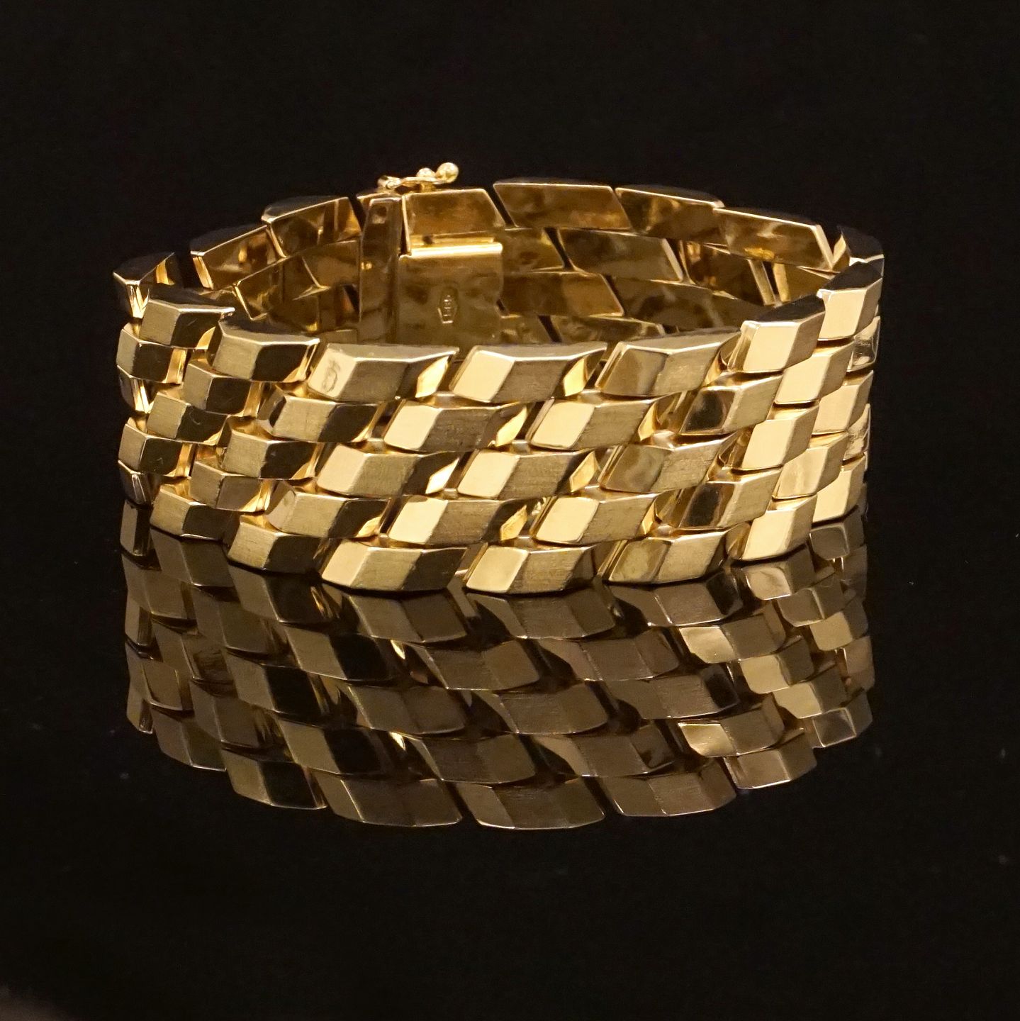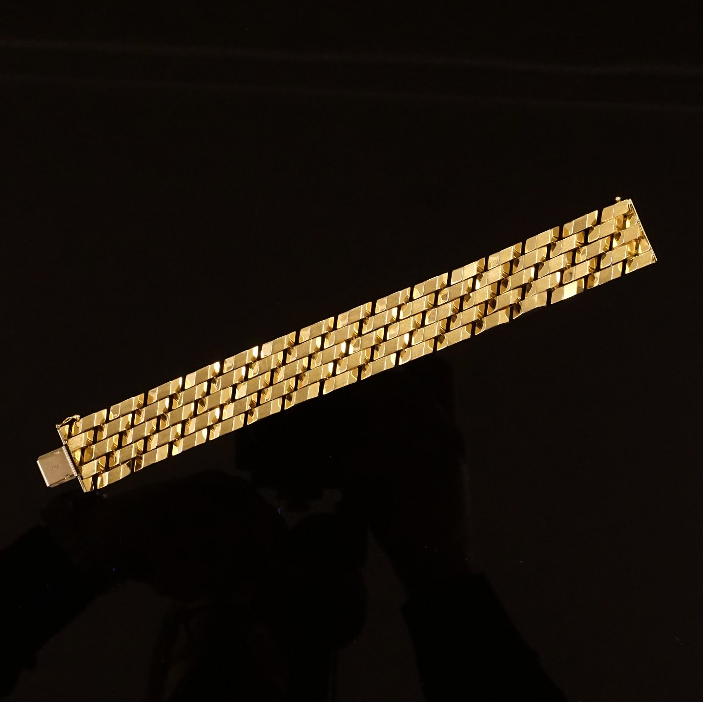 Bred 14kt guldarmlænke med fem rækker. L: 20cm. B: 2,2cm. V: 54gr