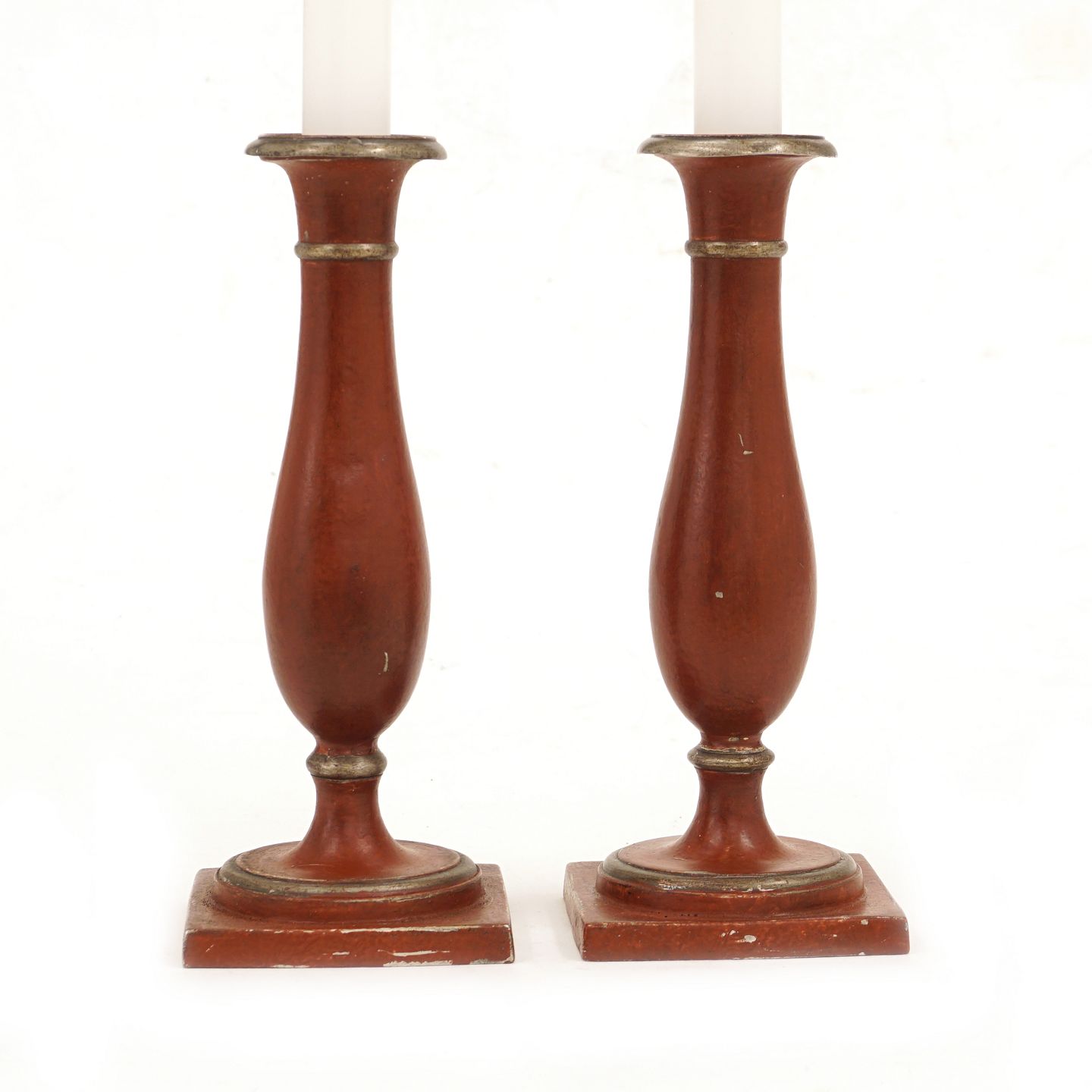 Augustenborgstager. Et par røddekorerede tulipanstager af typen augustenborgstager. Ca. år 1840. H: 21cm
