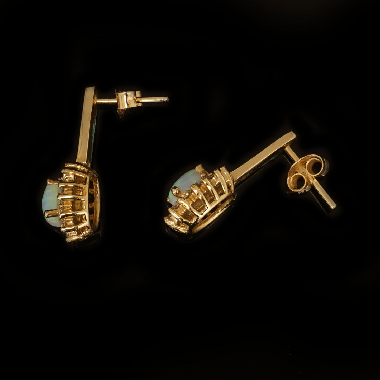 Pair of 14kt gold earrings each with an oval opal and 19 diamonds of ca. 0,015ct