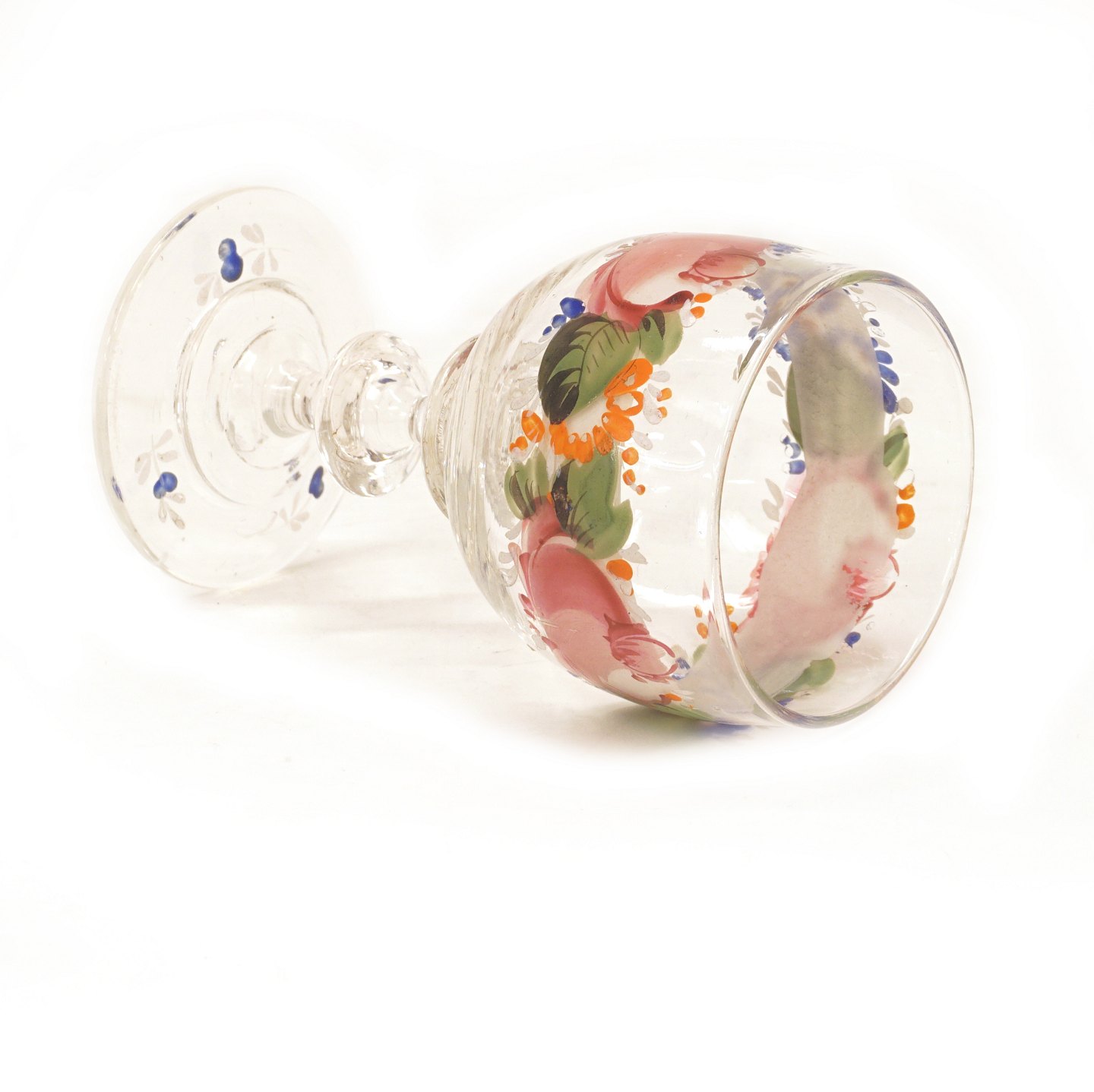 An enamel decorated wine glass. Circa 1860. H: 11,5cm