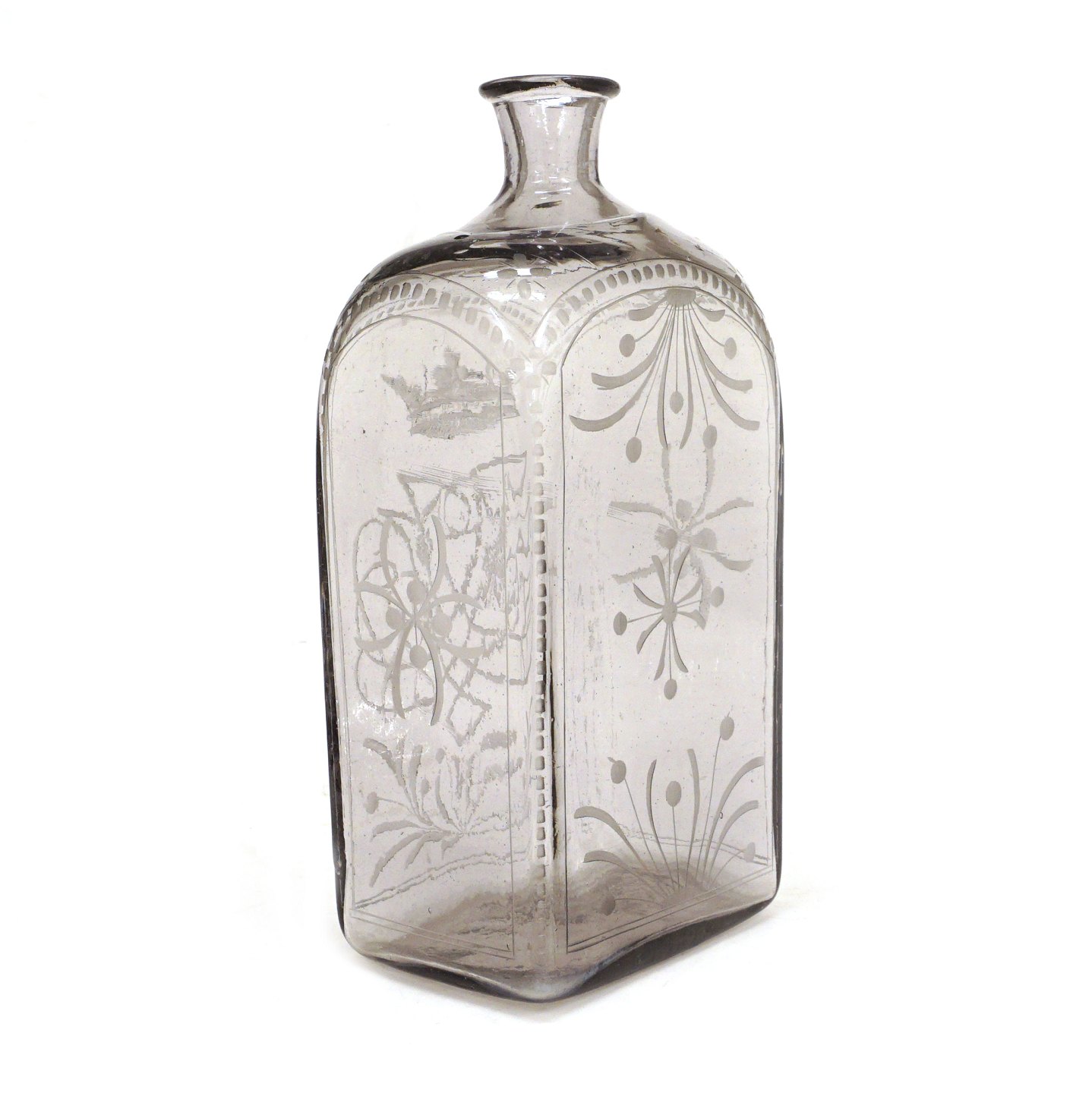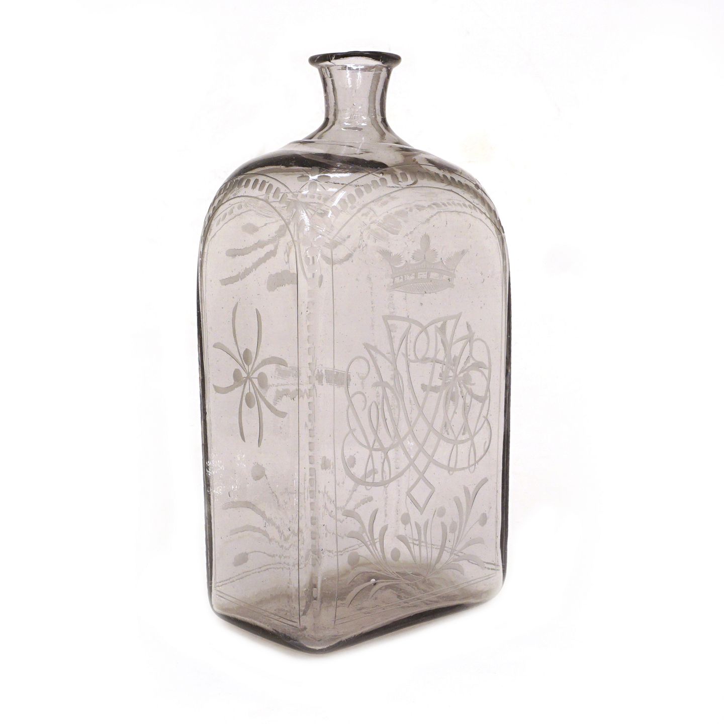 Kantineflaske med mørk sats. Prydet med kronet monogram "JMW" samt stiliserede blomster. Sverige eller Norge ca. år 1820. H: 28cm