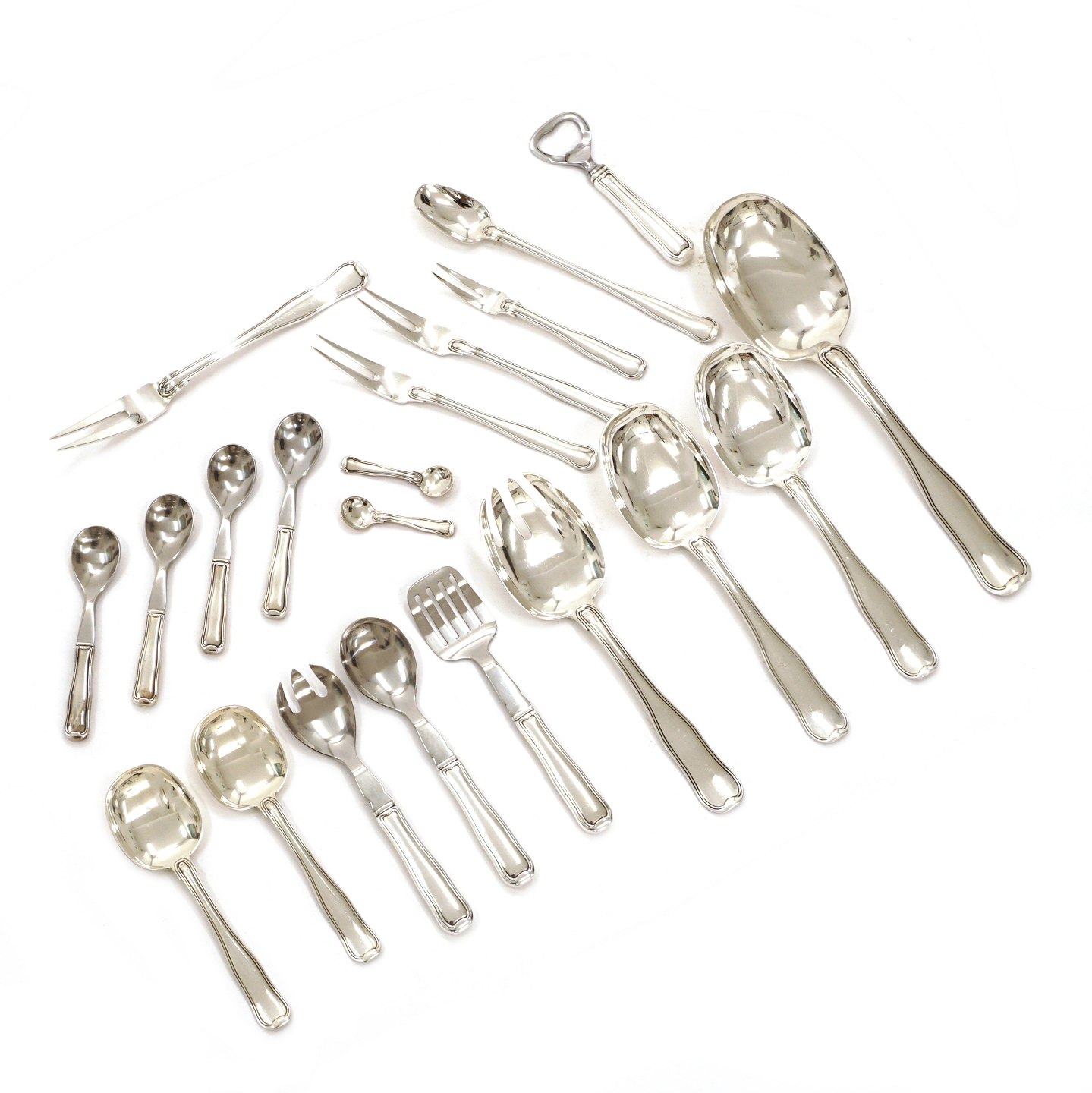 Georg Jensen dobbeltriflet sølvbestik til 12 personer. Formgivet af Harald Nielsen for Georg Jensen. I alt 145 dele