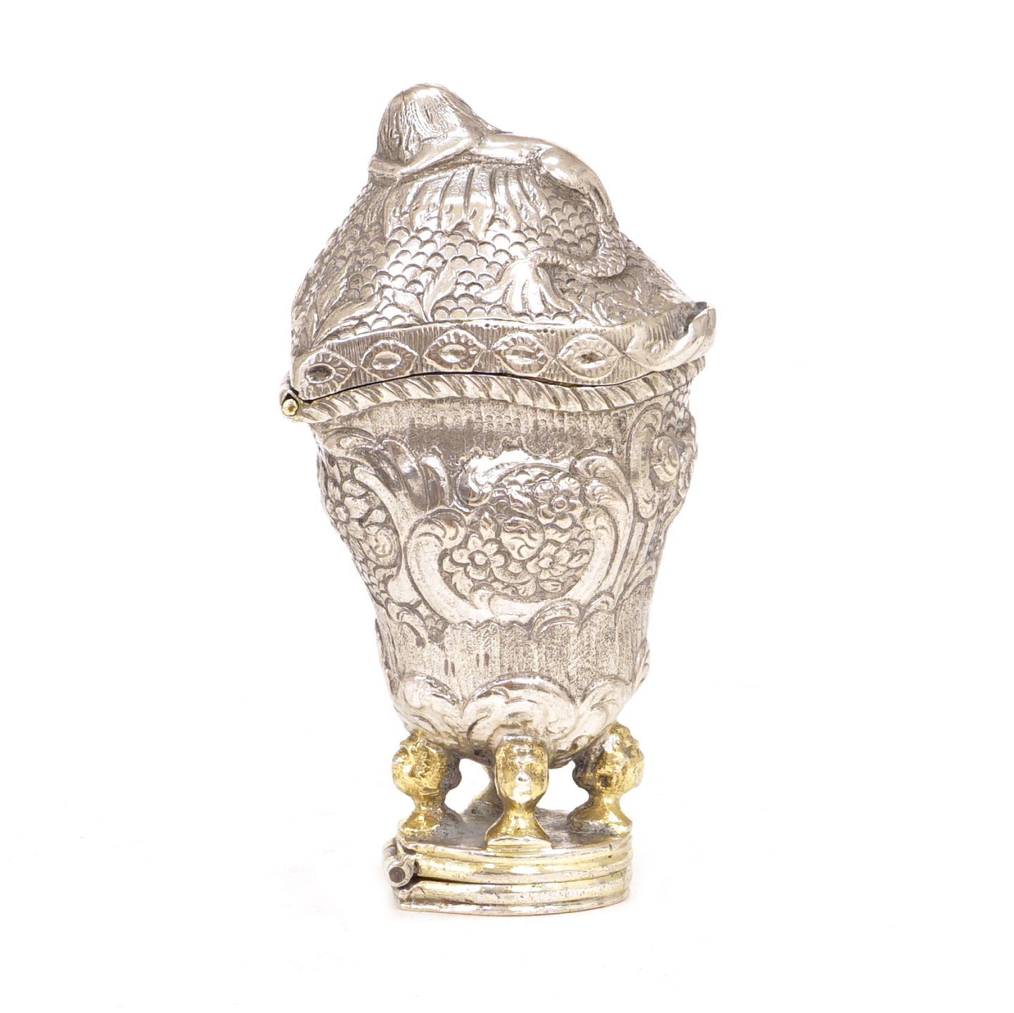 Norsk hovedvandsæg i delvist forgyldt sølv. Mester Frederik Mincke, 1745-75, Arendal, Norge. H: 7cm. V: 46gr