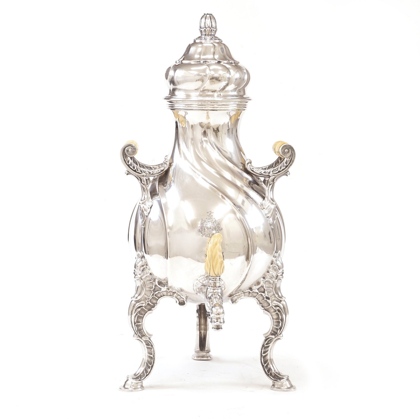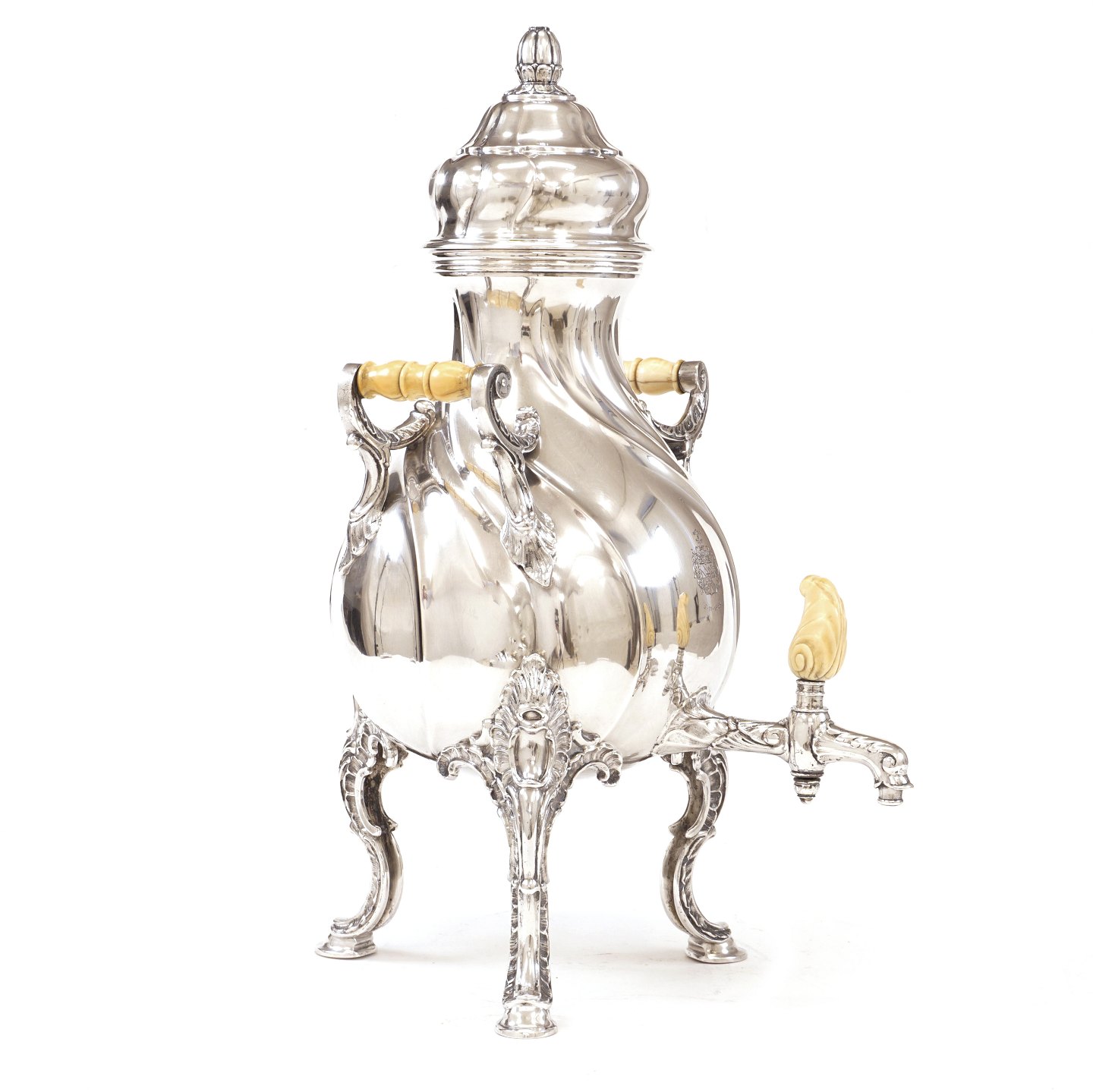 Large impressive Danish Rococostyle silver samovar. Dated 1920. H: 43cm. W: 2.352