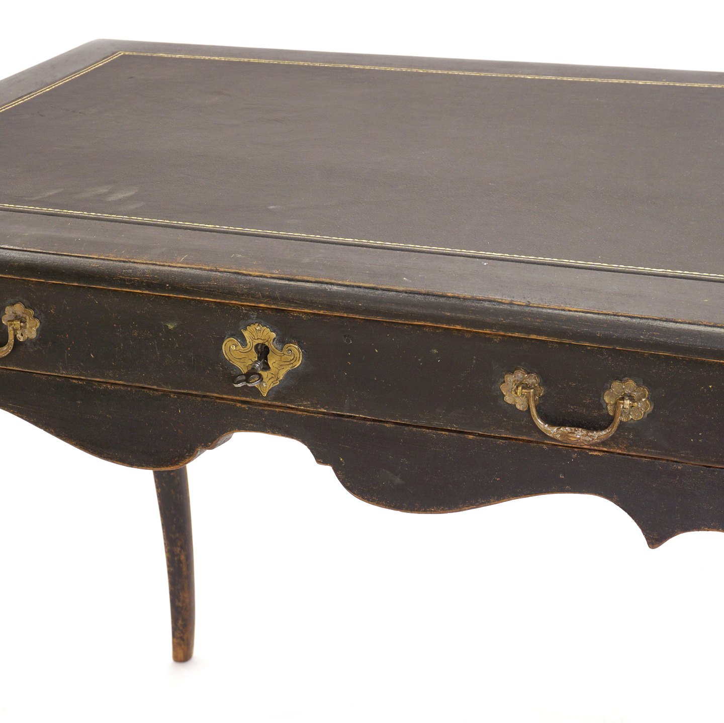 Black Rococo writing table with inset leather top. Sweden circa 1760. H: 74cm. Top: 85x60cm