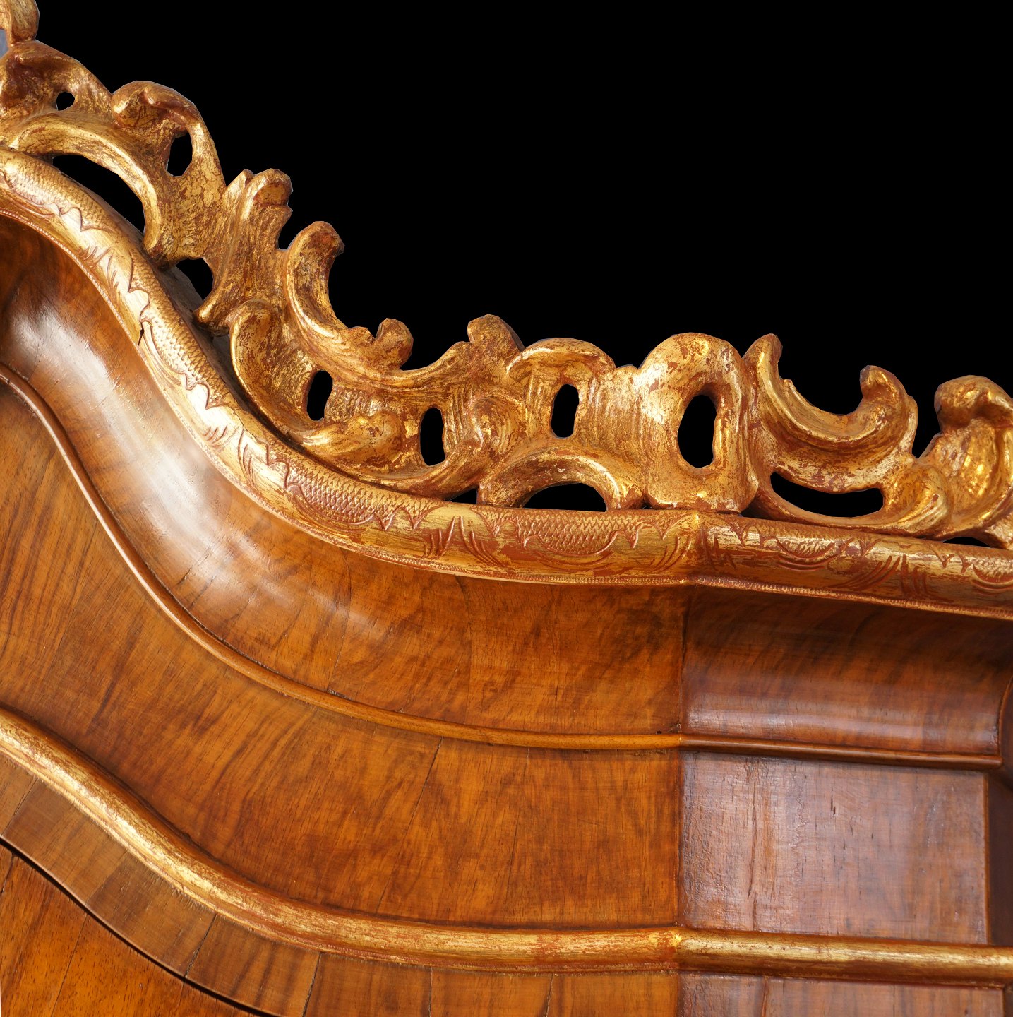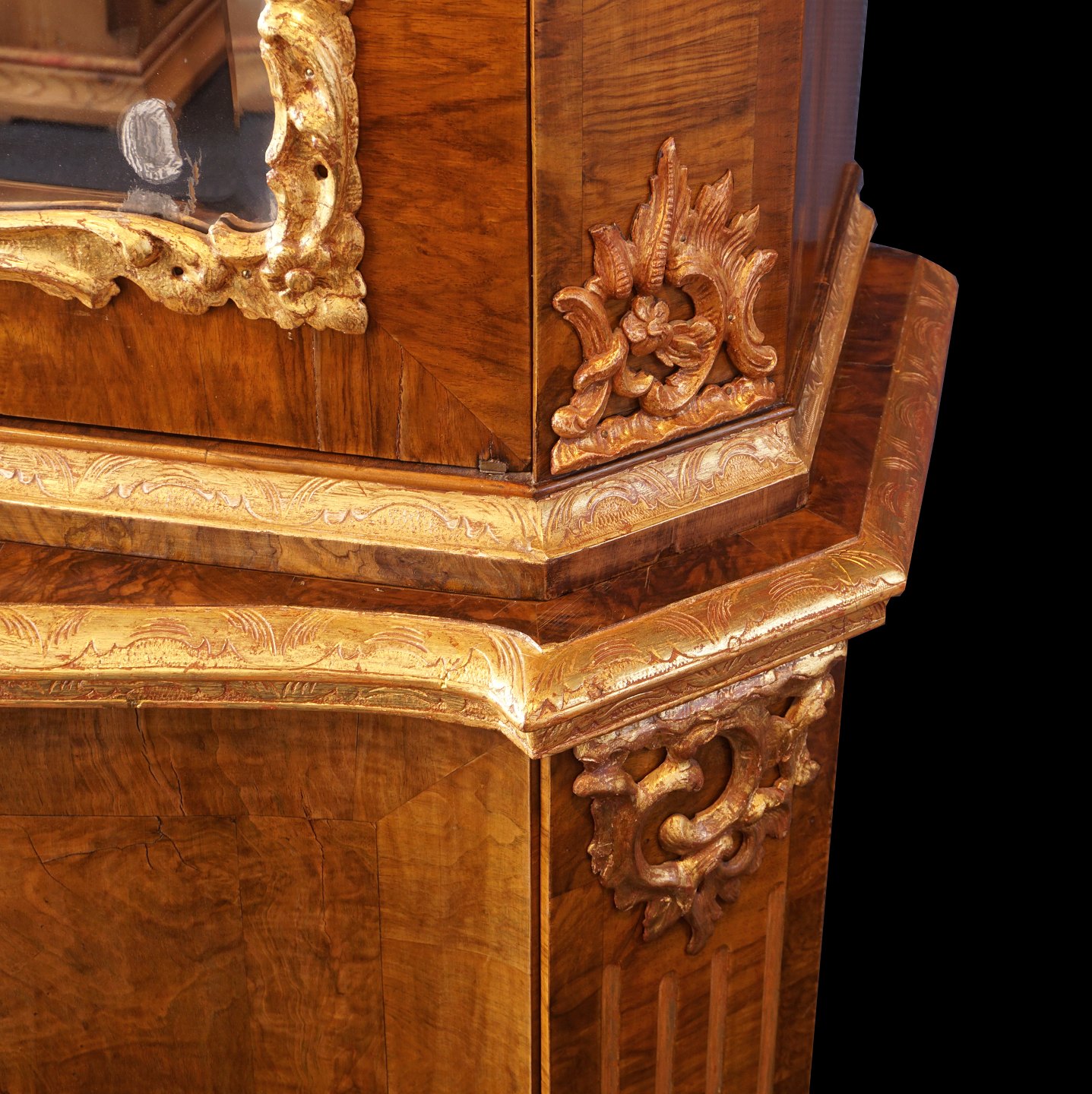 Walnut veneered and gilt mirror cabinet. Manufactured by Köster, Altona, circa 1760. H: 250cm. W: 120cm. D: 55cm