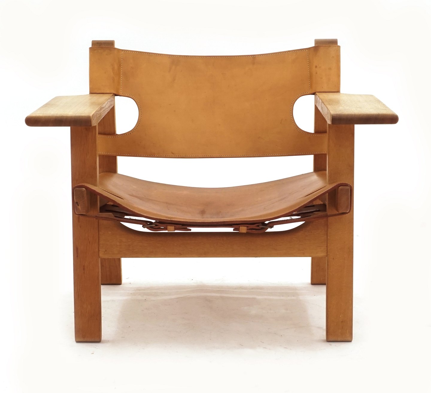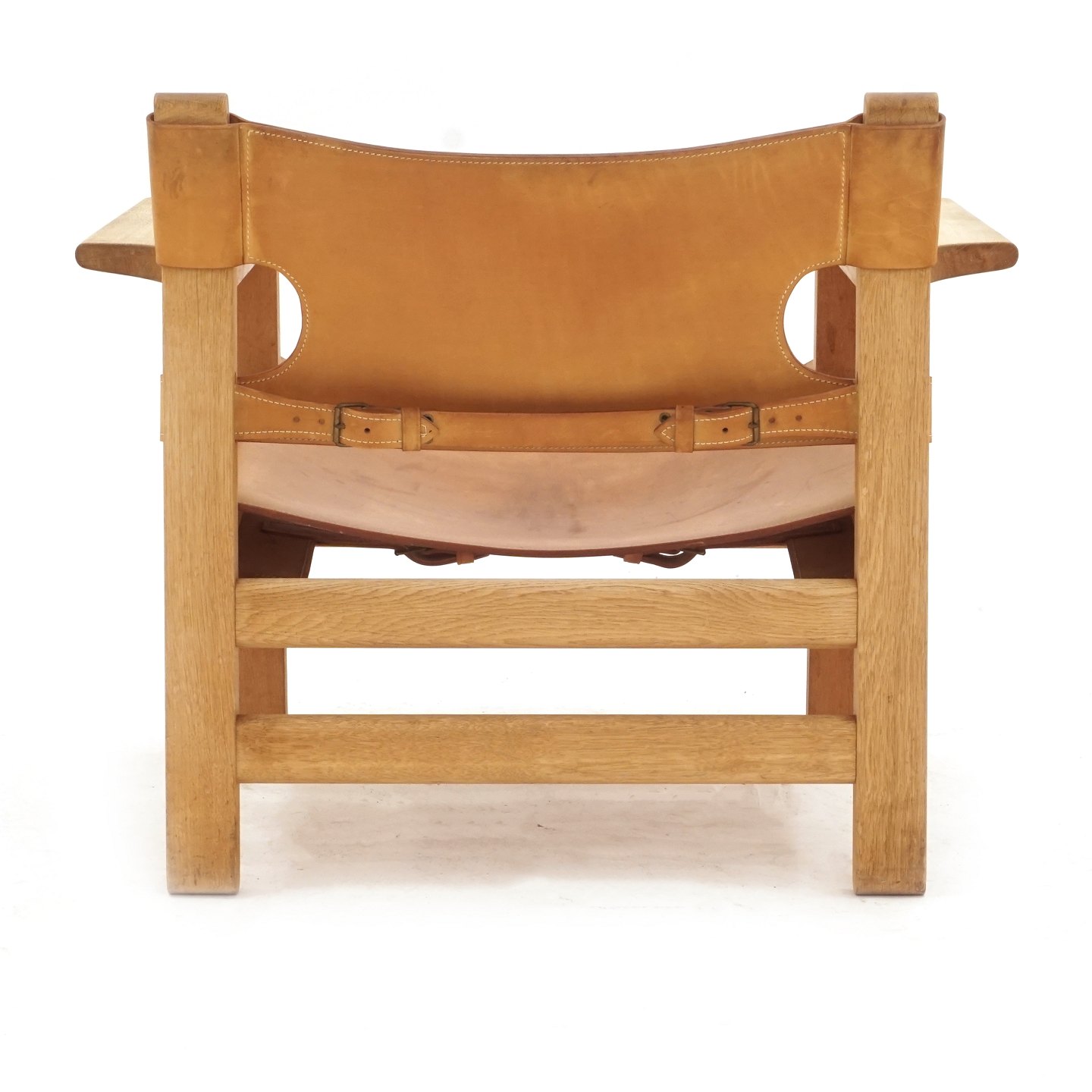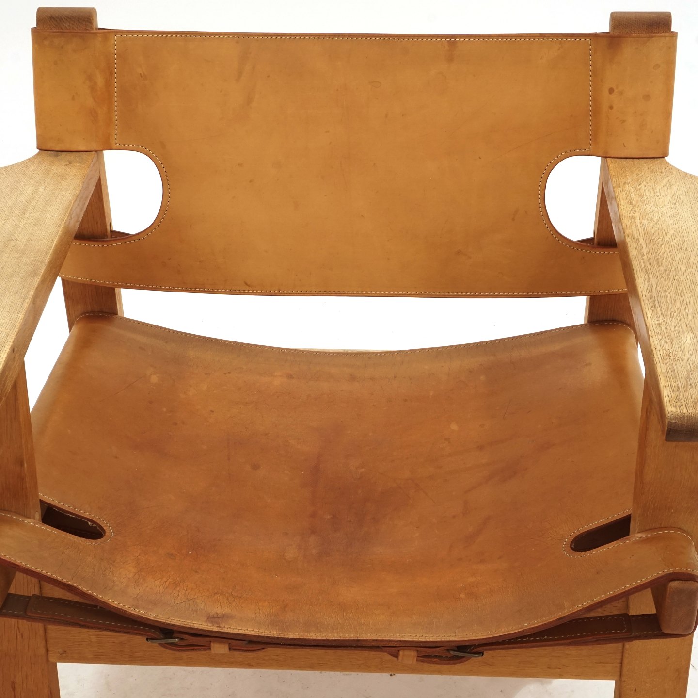Den Spanske Stol af Børge Mogensen med egetræsstel og originalt cognacfarvet kernelæder