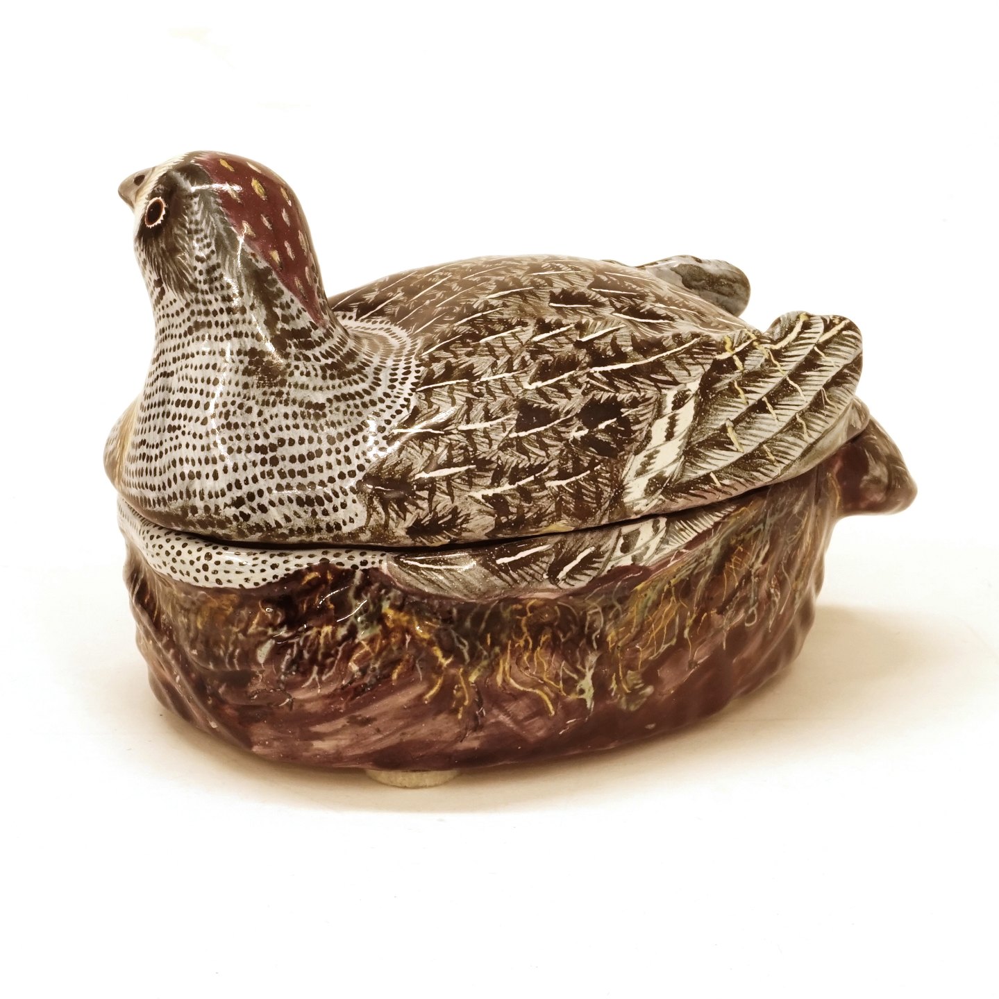 Polykrom dekoreret terrin i form af agerhøne