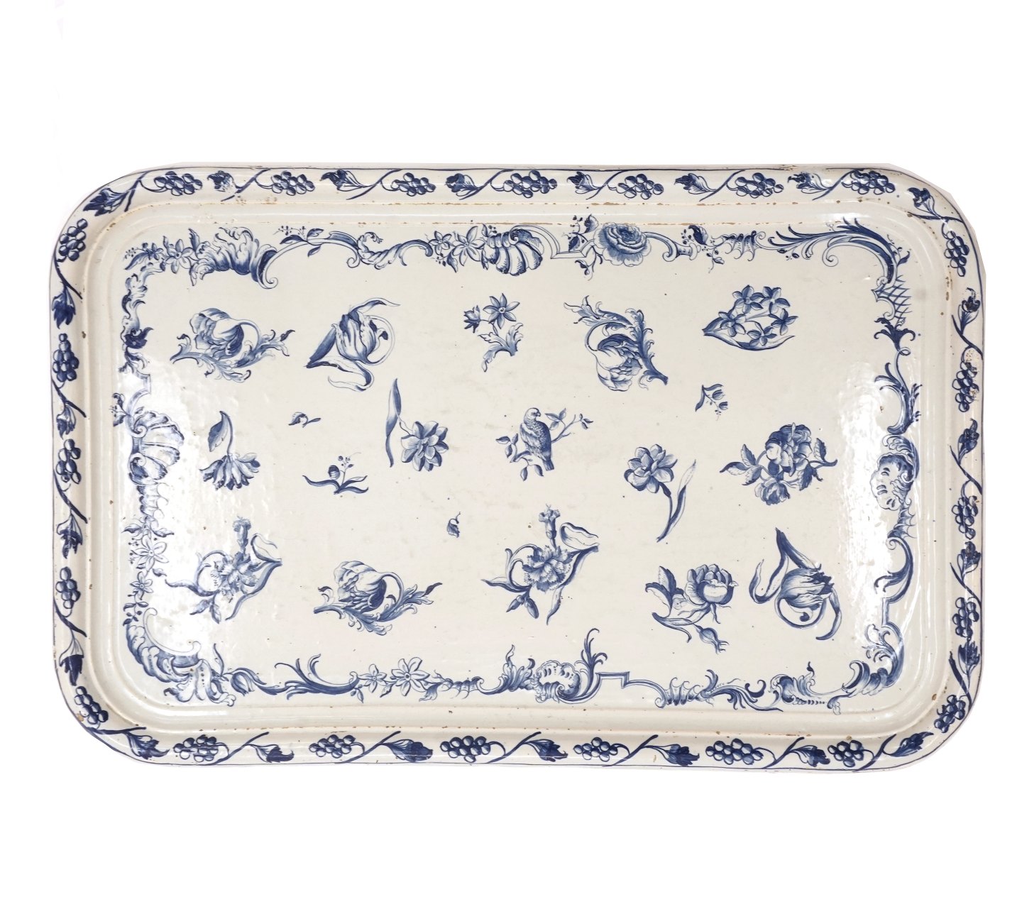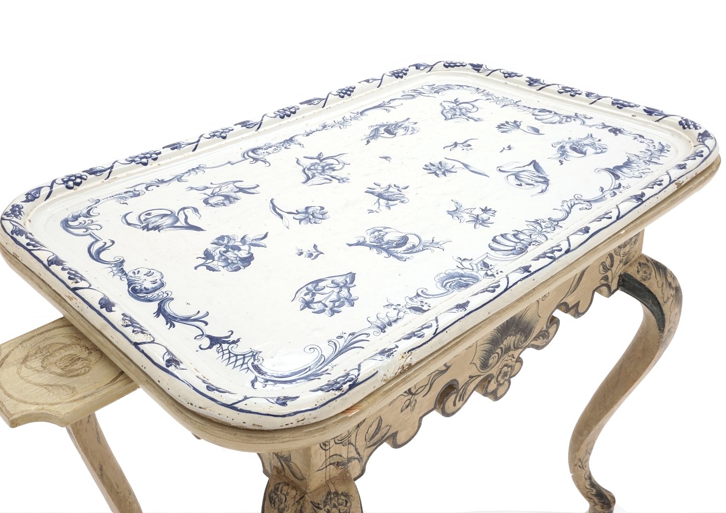 Blue decorated faience tray top Rococo table by the manufacture of Schleswig Signed circa 1760 H: 73cm. Top: 81x52cm Item number: 34345