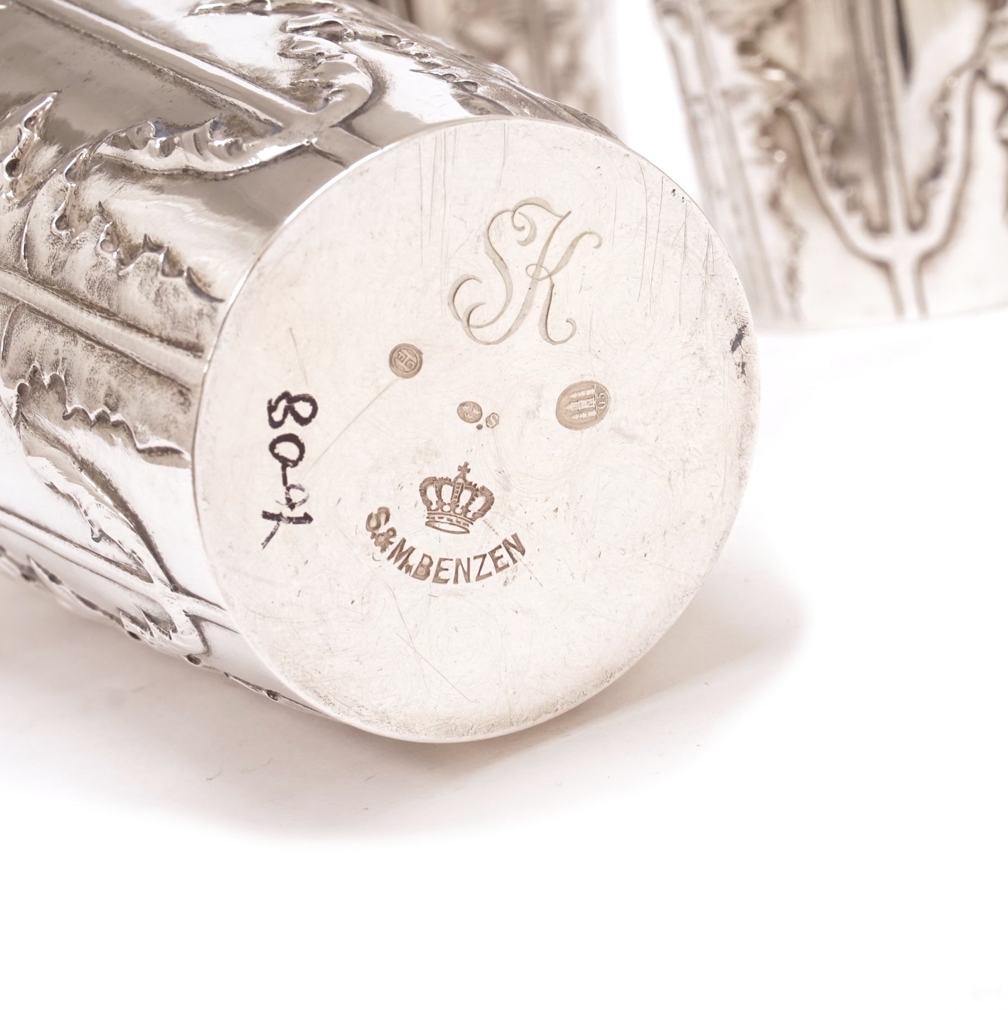 Sæt på seks cocktailbægre i sølv med indvendig forgyldning udført med mælkebøttemønster sandsynligvis efter forlæg af N. G. Henriksen, København