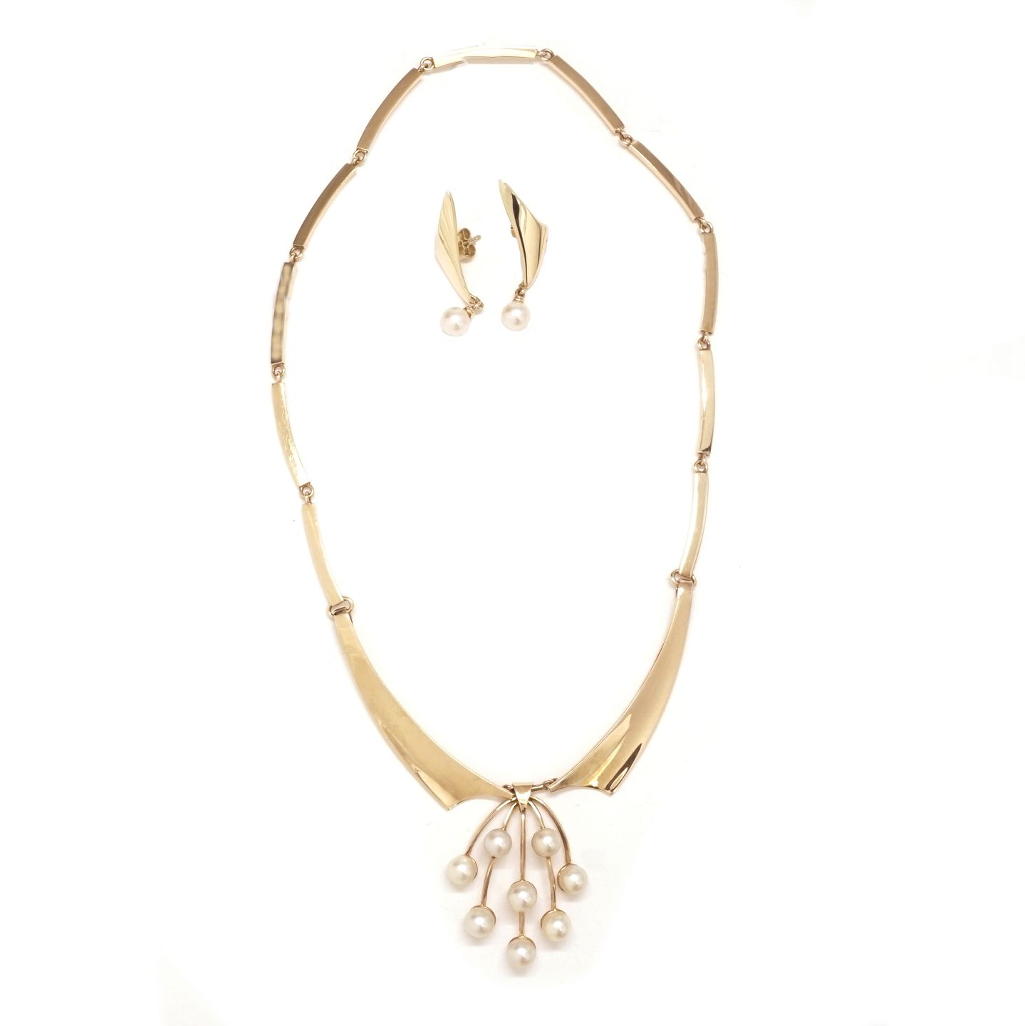 Just Andersen smykkesæt i 14kt guld bestående af leddelt halskæde med perlevedhæng og et par perleøreringe