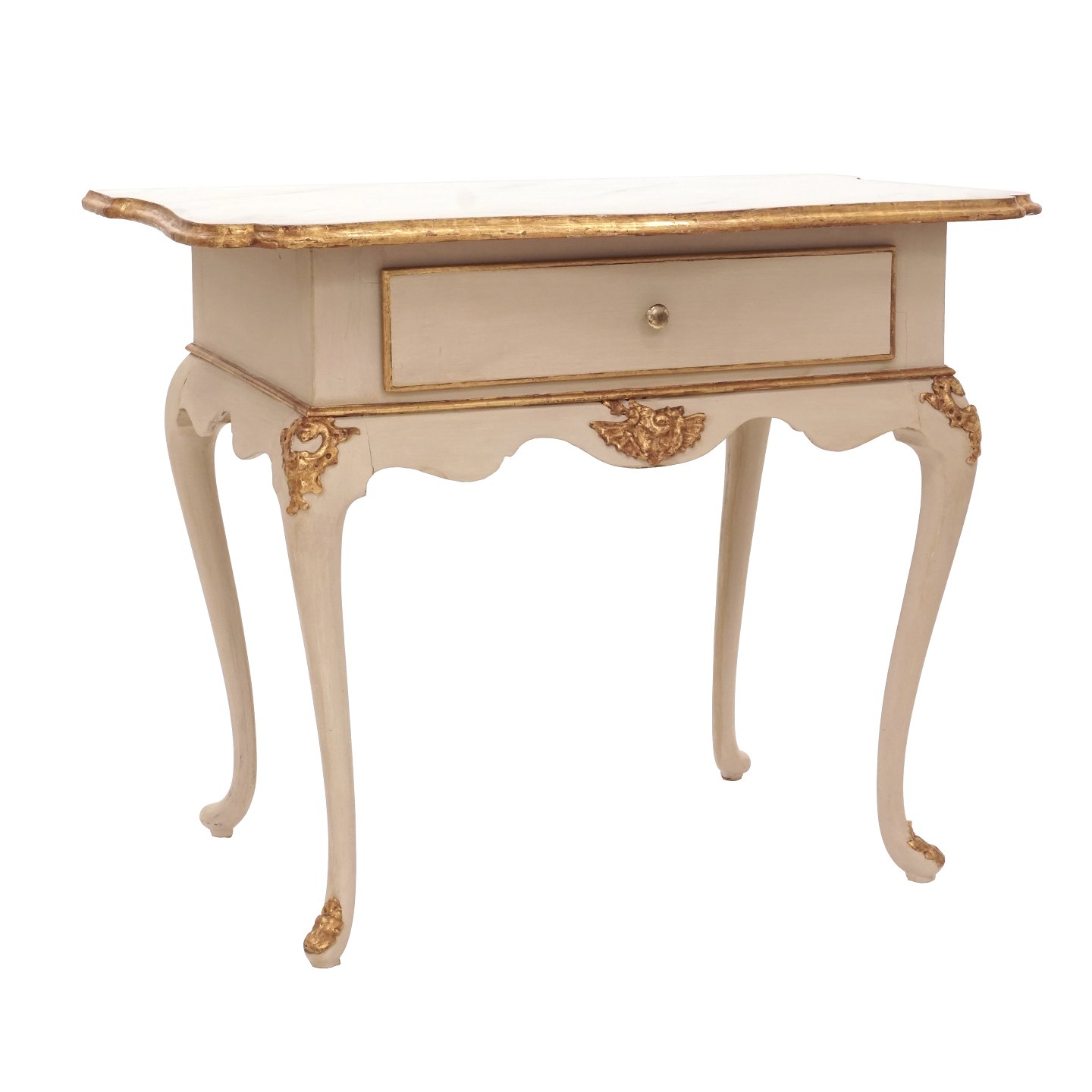 Pair of ivory white Rococo console tables with drawers and gilt carvings. Can be used freestanding. Denmark circa 1760. H: 77cm. Top: 61x94cm