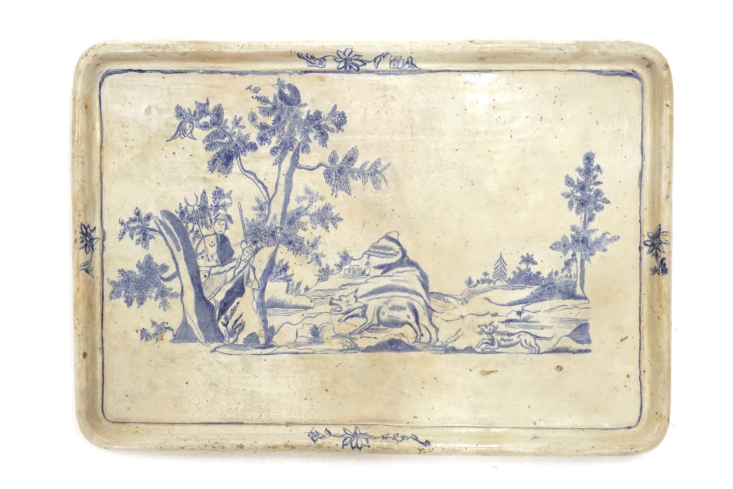Rigt dekoreret fajancebord med motiv i form af vildsvinejagt fra Morsø Fabrikken Morsø ca. år 1780