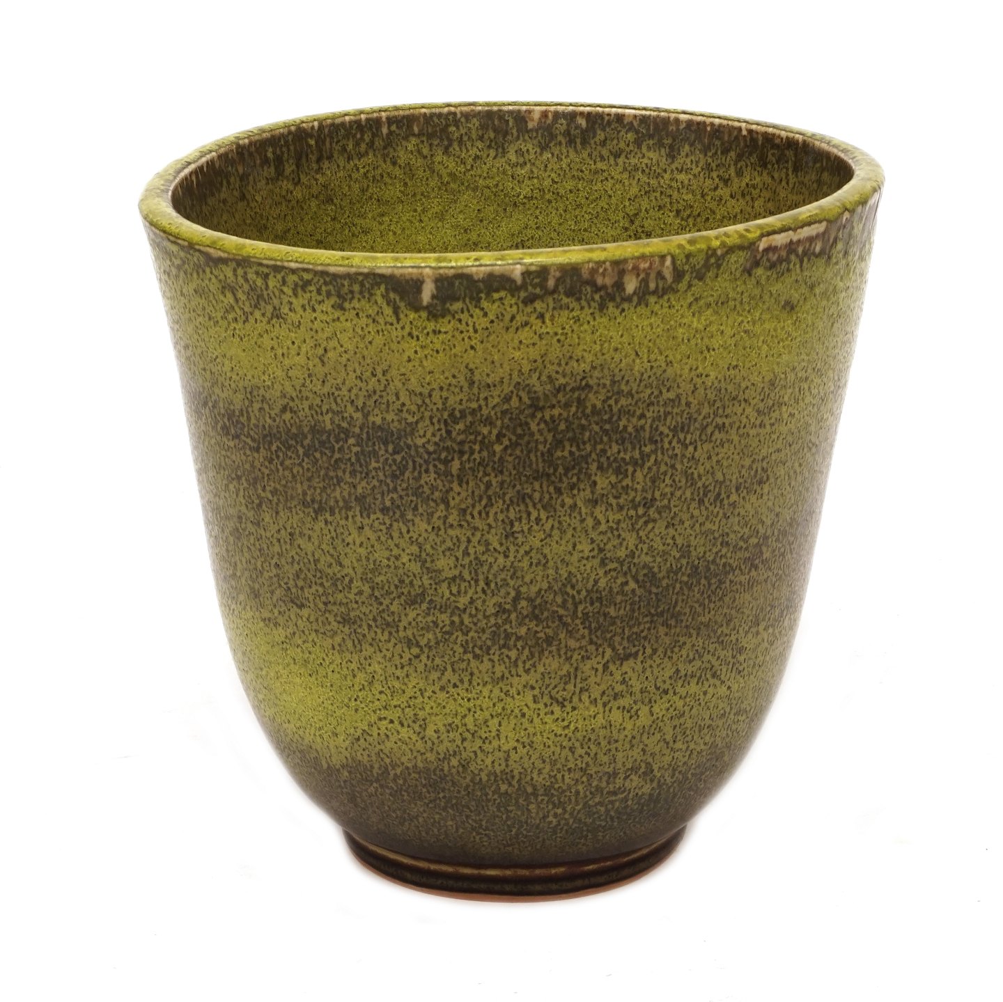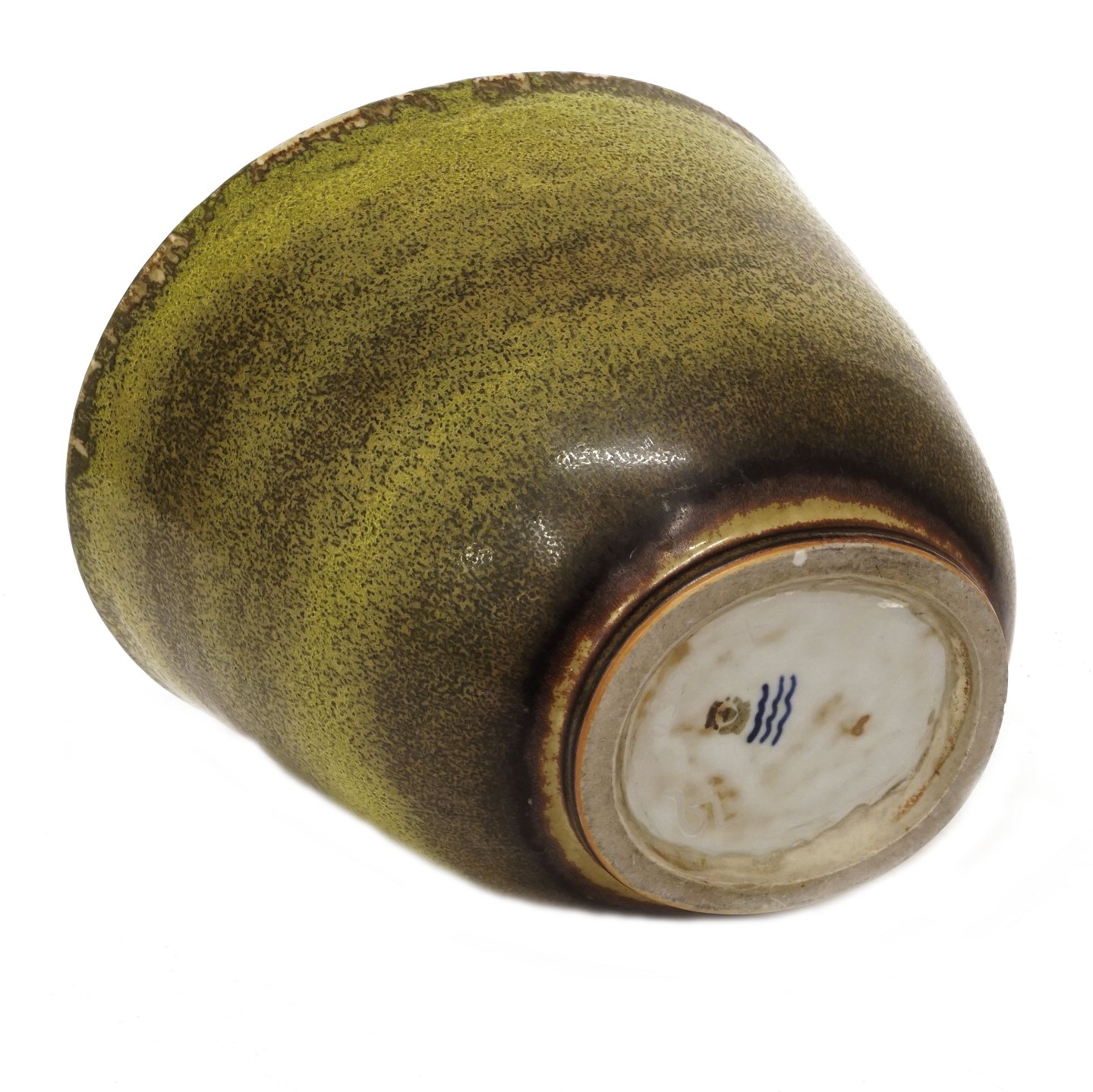 Stor Royal Copenhagen oval stentøjs vase med solfatara glasur signeret Nils Thorsson. H: 20cm. Mål foroven: 23x20cm