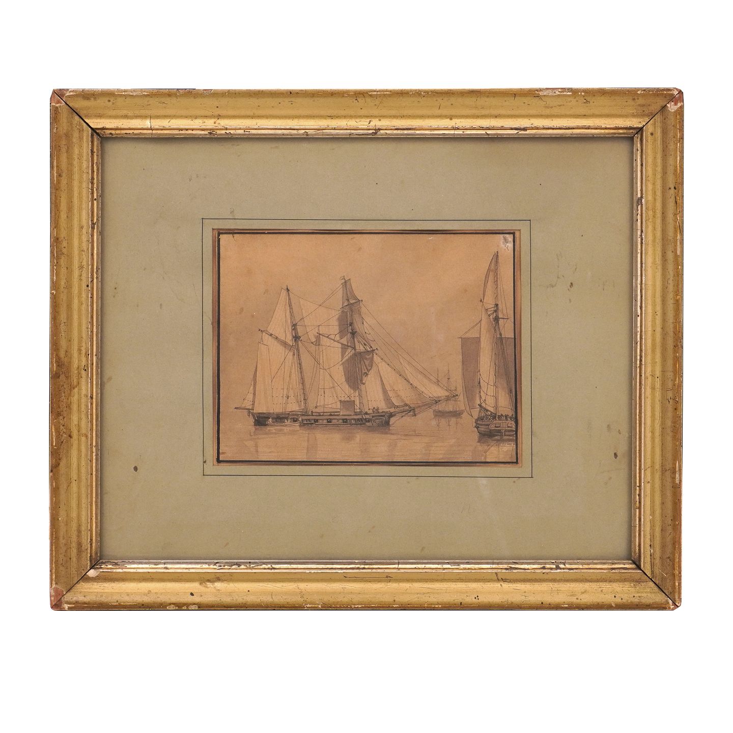 Marine drawing by C. W. Eckersberg, 1783-1853 Visible size: 12,5x16cm. With frame: 27,5x33cm Item number: 35522