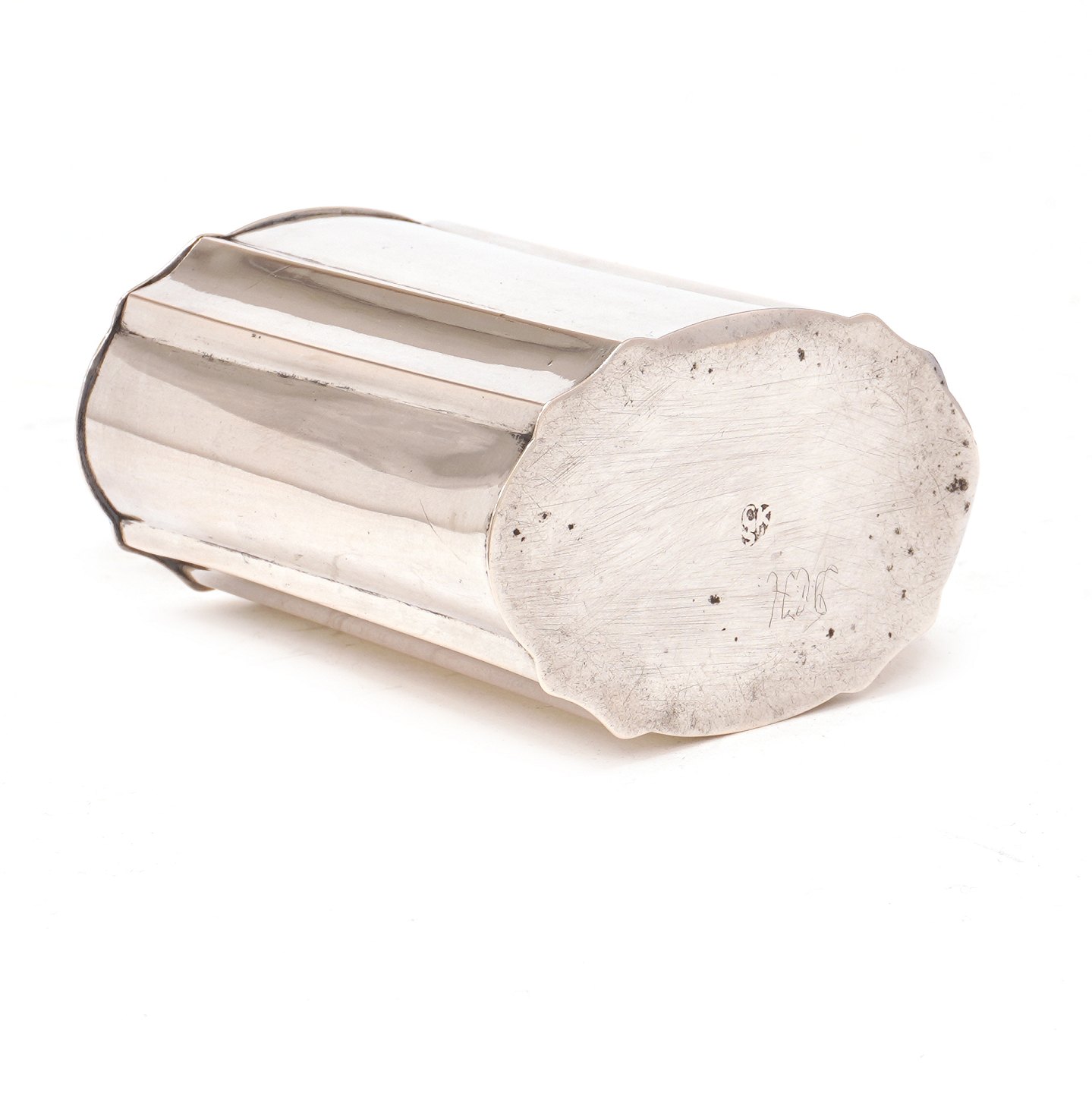Ligeknækket barok tedåse i sølv. Fremstillet af mester Christen Knudsen, Aalborg, 1746-61. H: 10,5cm