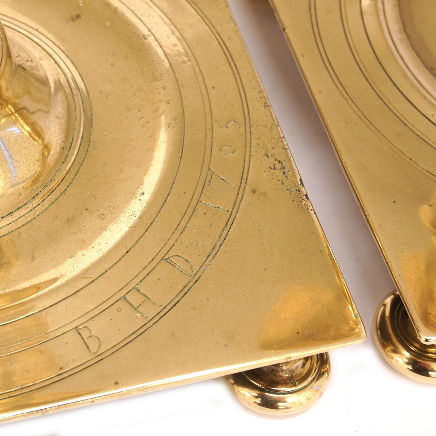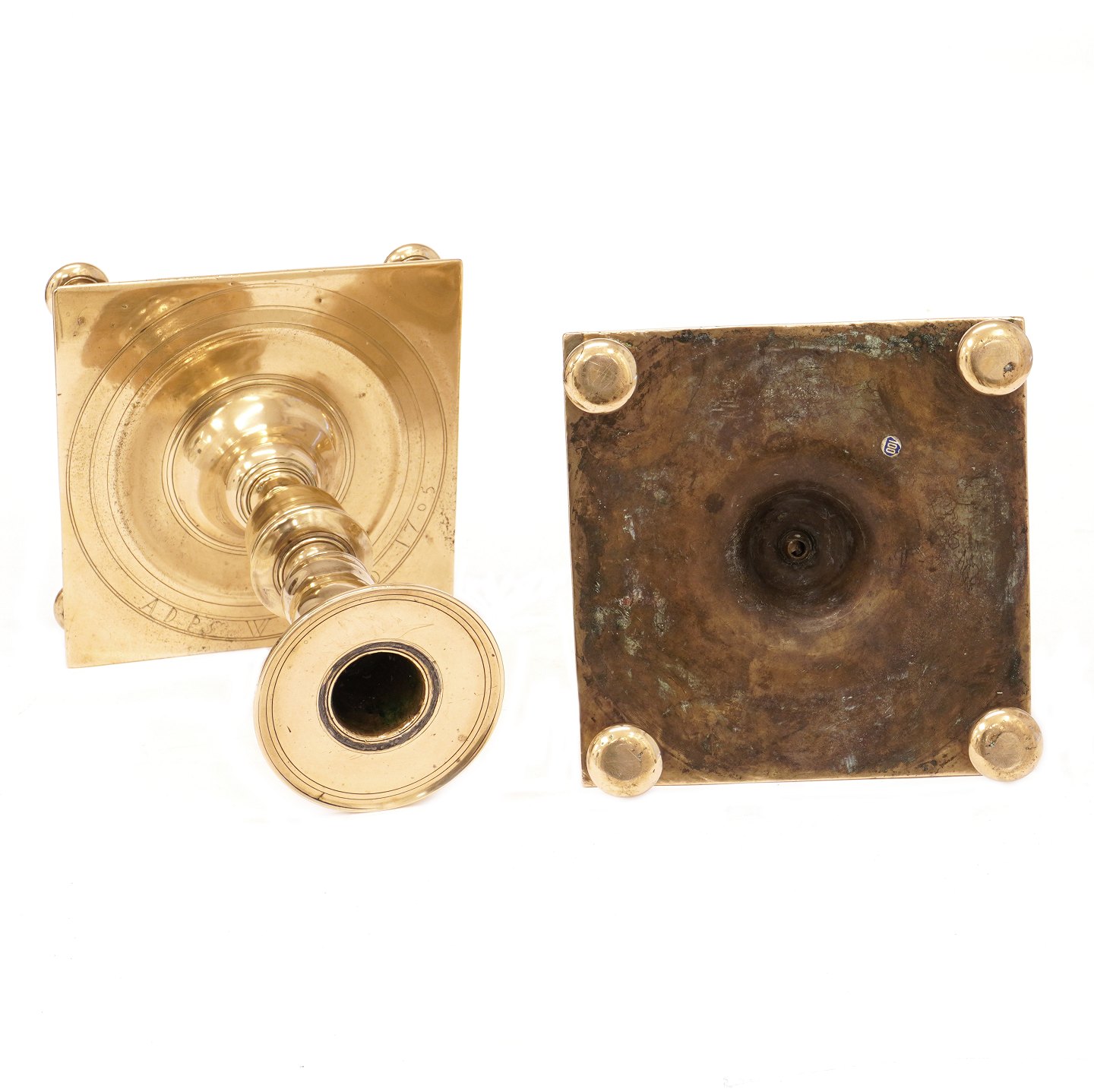 Pair of late 17th century Northgerman Baroque Brass castle candlesticks dated 1705 H: 24cm. Base: 17,5cmx17,5cm Item number: 103 D